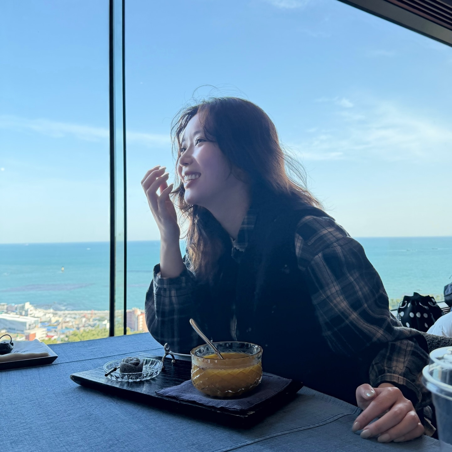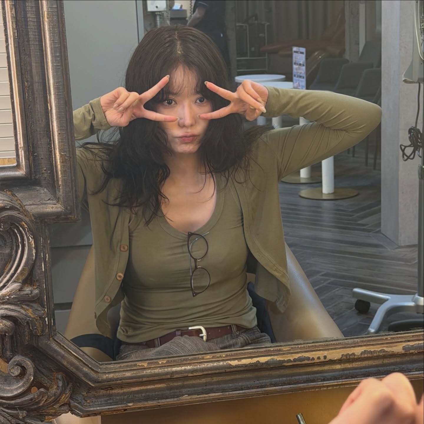 옷 역시 헤어가 만든 분위기를 절대 해치지 않는 센스 있는 조합이에요. 체형을 은은하게 드러내는 카키 컬러 니트 가디건 위에 짙은 브라운 가죽 벨트를 올려 안정감 있으면서도 레이어가 풍부한 컬러 조화를 구현했거든요 😍 어스 톤 기반의 동일 계열 배색은 데일리 스타일링에서도 실패 없이 쓸 수 있는 컬러 법칙이에요. 가슴 쪽에 안경을 무심히 걸어둔 디테일이 '일하는 모드'와 '쉬는 모드' 경계의 쿨한 텐션을 완성해주는데, 빈틈없는 정석보다 이렇게 가볍게 힘을 뺀 스타일이 오히려 더 고급스럽다는 걸 보여주는 예시예요 💯