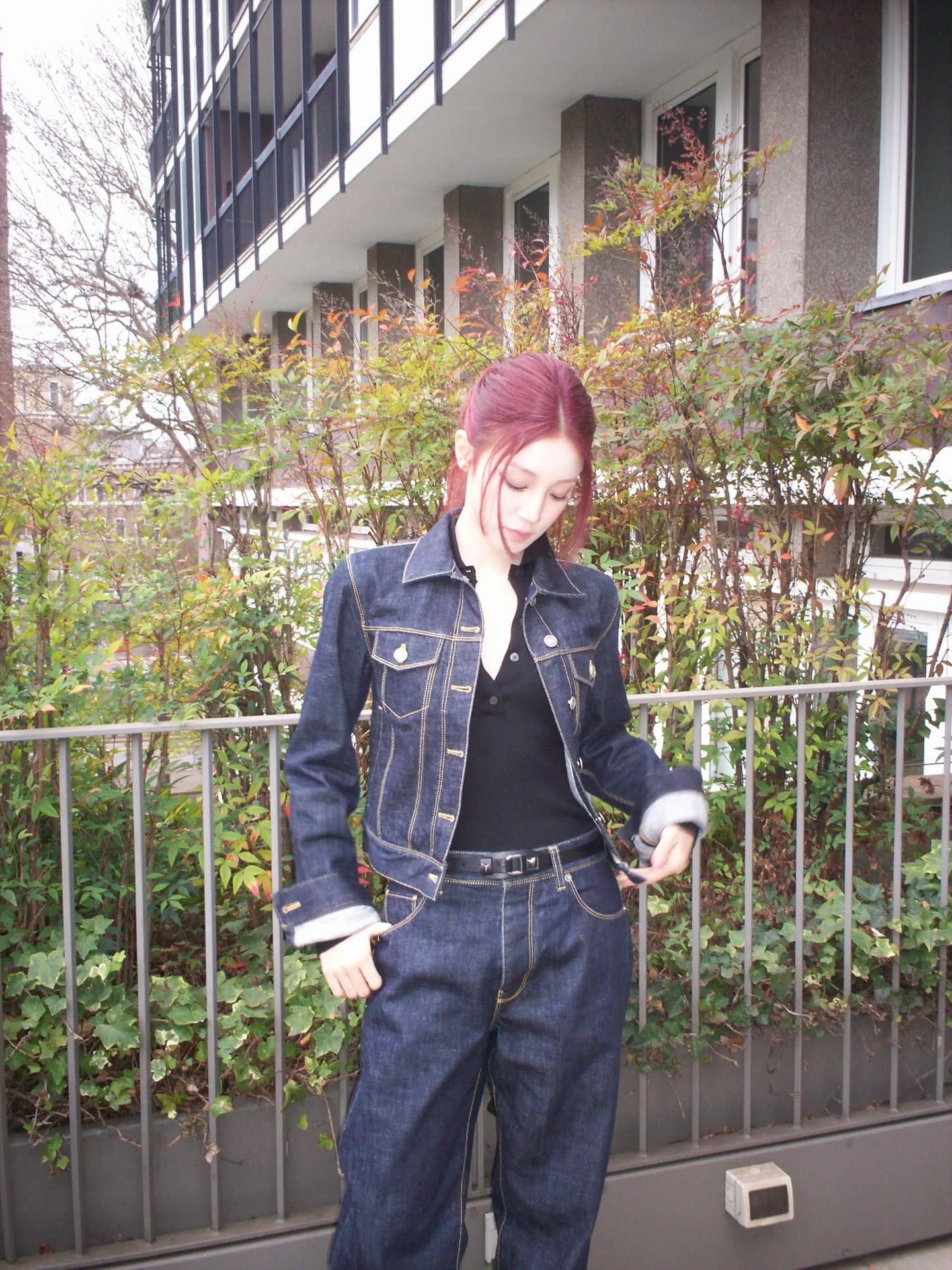 (여자)아이들 우기가 고른 데님은 흔히 볼 수 있는 밝은 워싱 데님이 아닌 딥하고 다크한 생지 데님이에요 🌑 상의와 하의 모두 동일한 톤으로 맞춰 세련되고 정제된 분위기를 연출했는데, 재킷 앞단을 살짝 열어 블랙 이너를 노출한 디테일이 결정적인 포인트랍니다. 청청 패션도 이 정도로 쿨해질 수 있다는 것을 우기가 몸소 보여주고 있어요. 레드 브라운 헤어가 어두운 데님 컬러와 선명하게 대비되어 얼굴을 한층 돋보이게 만들어주네요 ✨