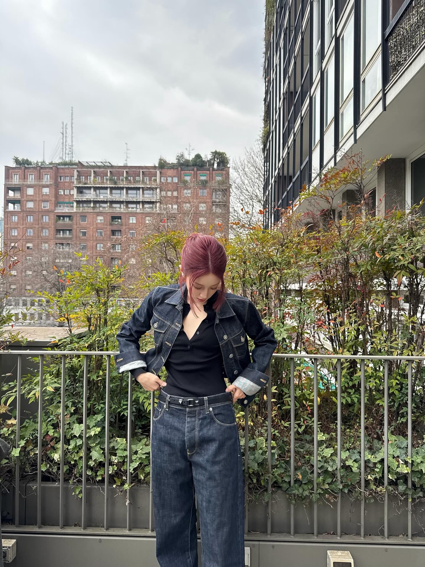 벽돌 질감 배경에서 빛나는 데님 셋업의 미학 🧱