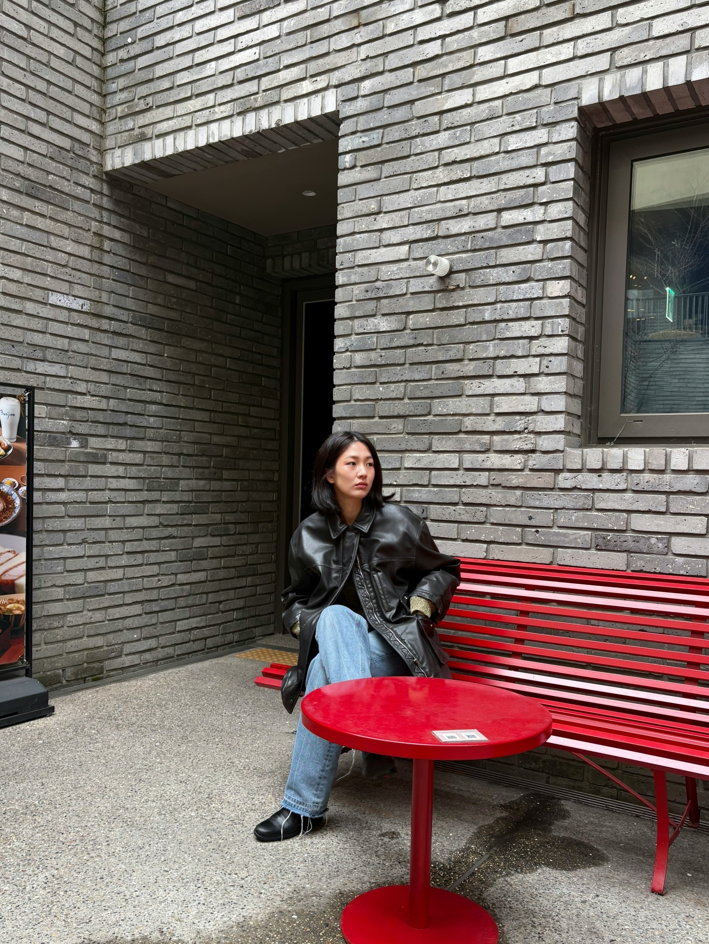 회색 벽돌벽 앞에서 시크한 아우라를 뿜어내는 박승희의 스트릿 무드! 💫 오버핏 블랙 레더 자켓에 연청 데님을 조합해 무게감은 줄이고 스타일은 살렸어요~ 다리를 꼬고 앉은 여유로운 자세가 룩의 완성도를 한층 높여주네요 🖤 박승희 레더 자켓 매치, 이건 그냥 입은 게 아니라 완벽 소화랍니다!