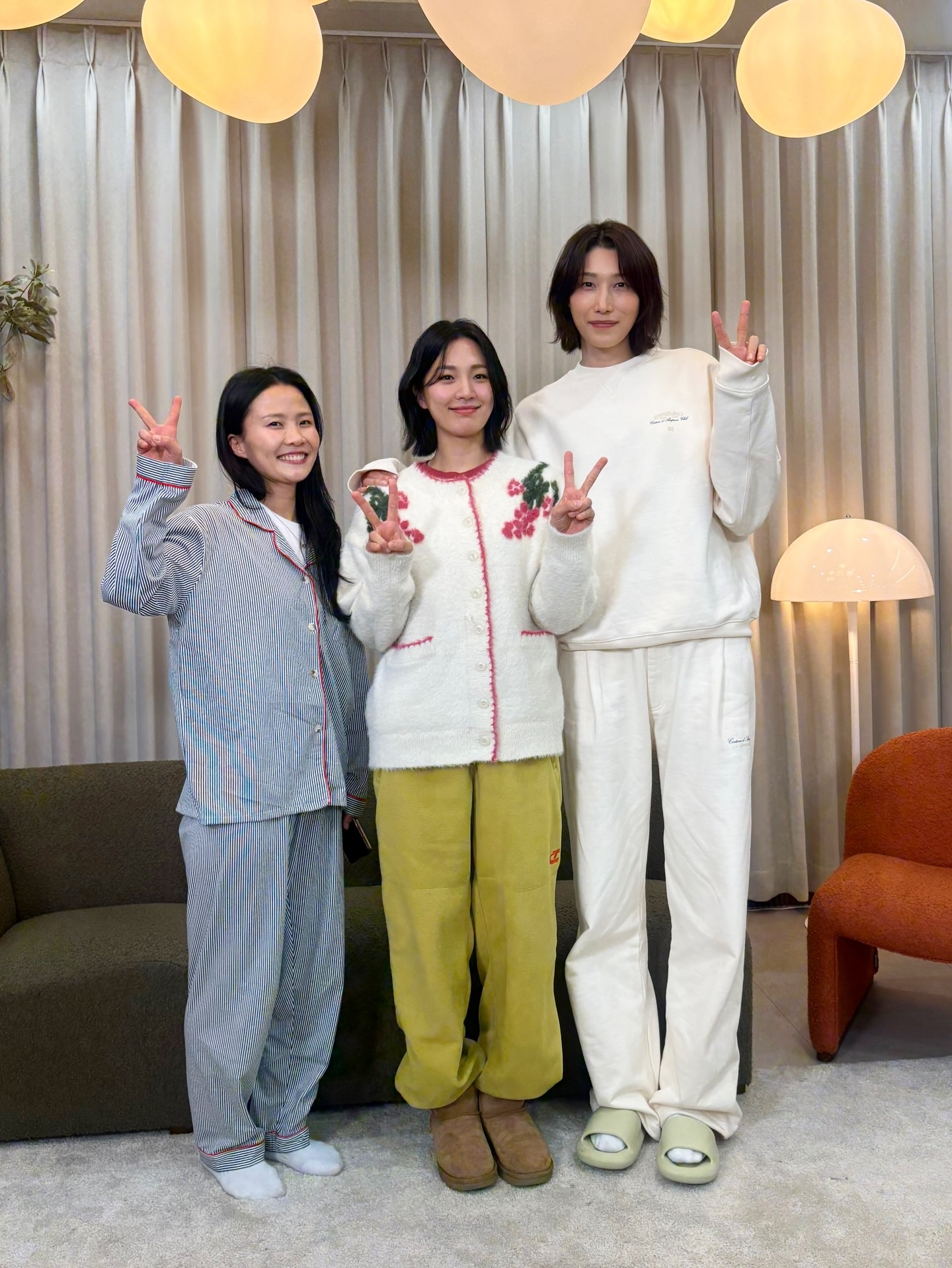 친구들과 함께한 릴랙스 타임에서도 박승희의 패션 센스는 빛났어요! 화이트 니트 가디건에 새겨진 체리 자수가 사랑스러운 포인트 🍒 올리브 와이드 팬츠와 어그 부츠 조합으로 편안하면서도 감각적인 룩을 연출했답니다~ 박승희의 홈웨어 스타일에서도 컬러 조화 능력이 빛나네요 💚