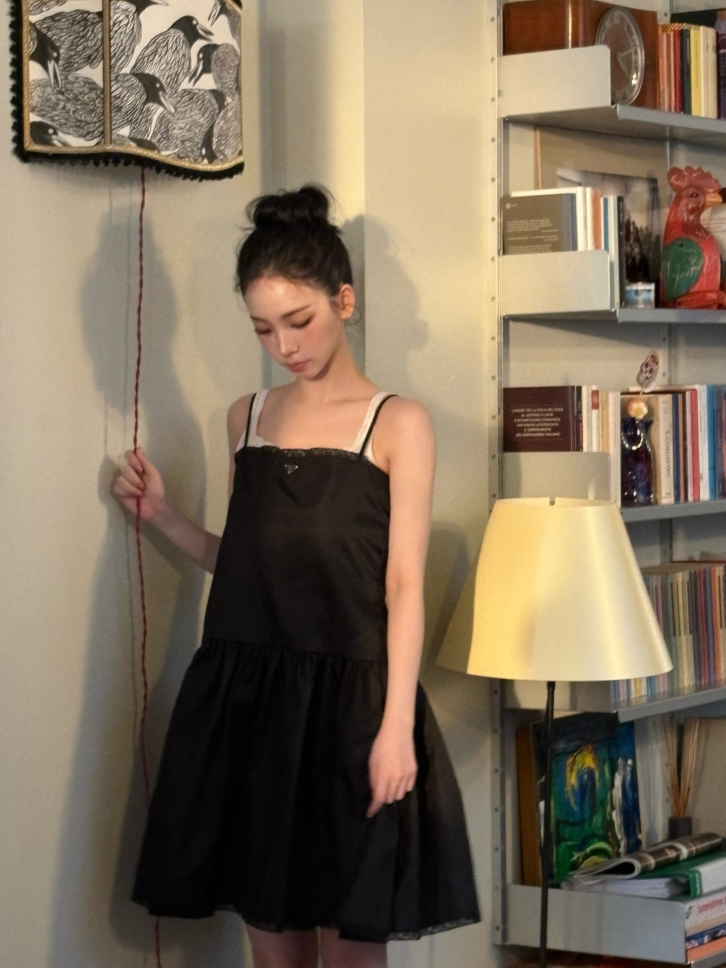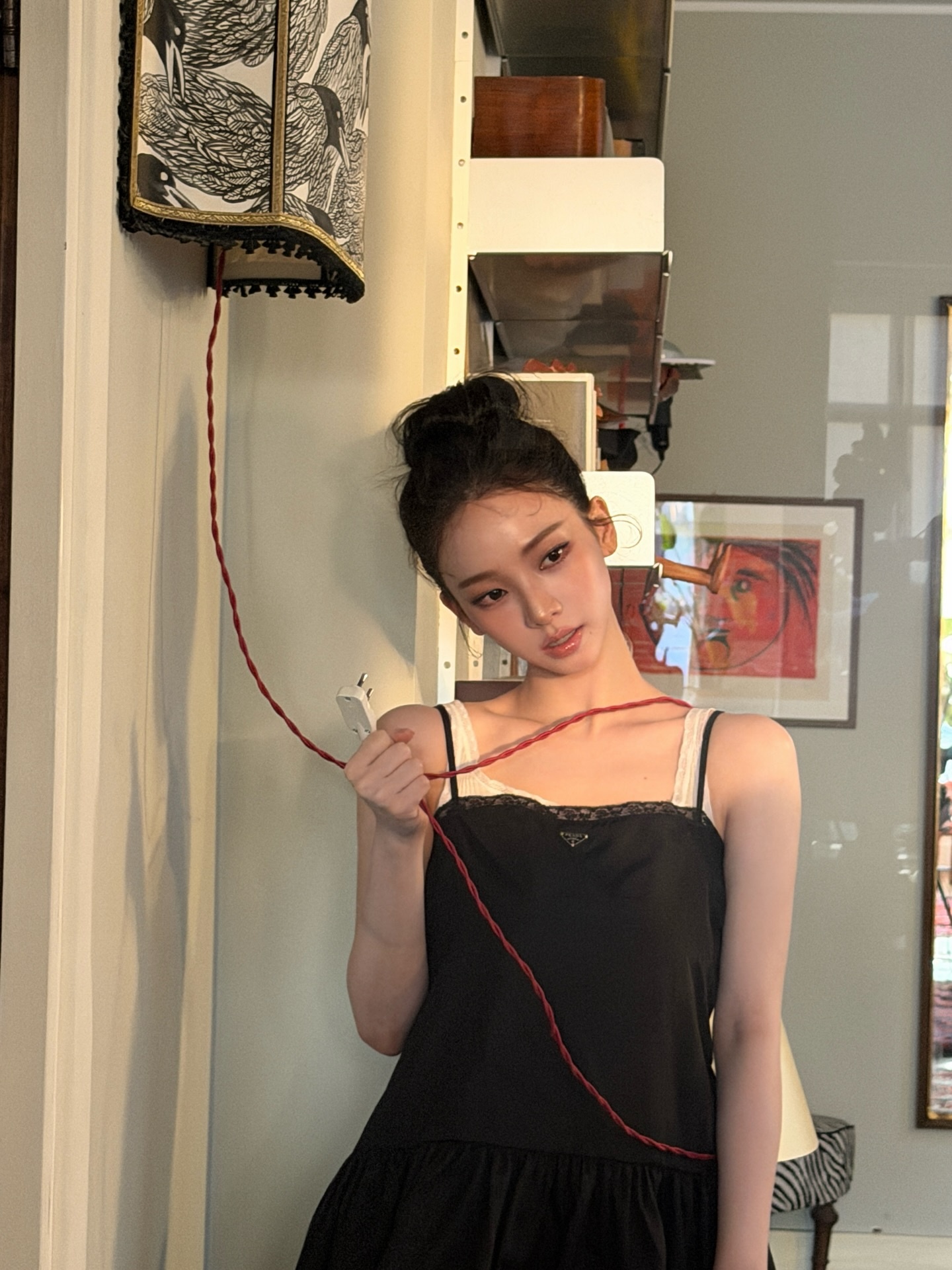 카리나의 이번 프라다 룩에서 가장 눈에 띄는 포인트는 스커트 하단의 볼륨 실루엣이에요 🎀 슬림한 상반신에서 아래로 내려갈수록 풍성하게 펼쳐지는 A라인 스커트가 올블랙에 입체감을 선사했죠. 스파게티 스트랩과 레이스 디테일의 섬세한 조화까지, 미니멀하면서도 여성스러운 프라다 미학을 카리나가 완벽하게 살려냈어요 💕