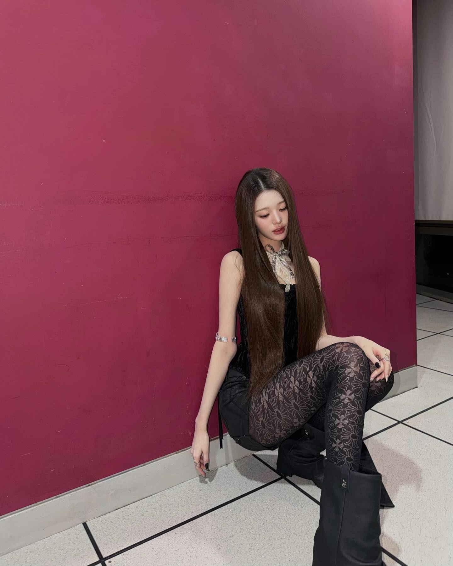 이번 코디의 포인트를 꼽자면 단연 하체 스타일링이다. 꽃무늬가 촘촘하게 새겨진 블랙 망사 타이즈는 고딕과 페미닌을 동시에 아우르는 독특한 매력을 발산하고, 투박한 블랙 부츠와 만나 그 반항적인 무드를 한층 끌어올렸다. 크림슨 레드 벽에 등을 기대고 바닥에 다소곳이 앉은 포즈는 고독하고 쓸쓸한 록스타의 감성을 연상케 하며, 강렬한 배경색과의 대비가 전체 룩을 더욱 강하게 각인시킨다.