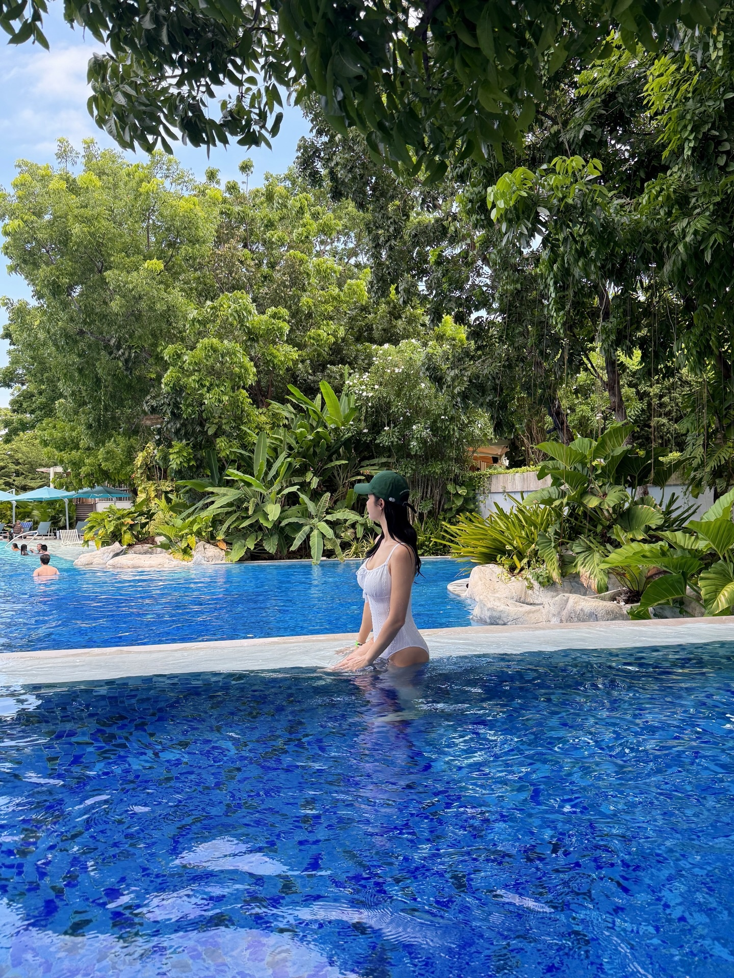 모델 한으뜸이 세부 리조트에서 화이트 원피스 스윔웨어와 딥 그린 캡 모자로 꾸안꾸 여름 스타일을 완성했습니다.
