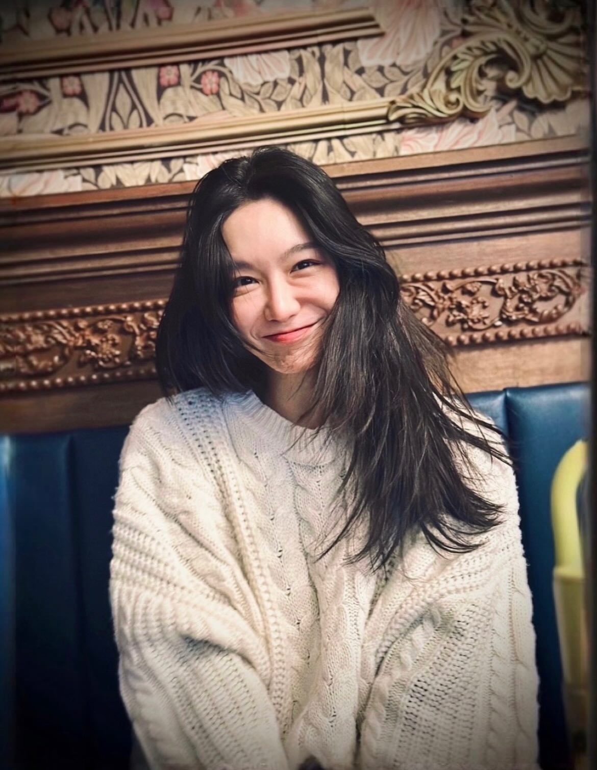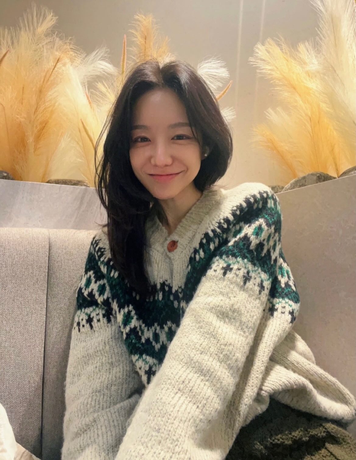 화이트, 그린, 네이비가 조화롭게 배합된 노르딕 패턴 가디건은 북유럽 감성의 빈티지 무드를 풍겨낸다. 팜파스 배경과 어우러진 차분한 표정이 따뜻한 겨울 룩에 깊이를 더해준다. 빈티지 카페에서 포착된 크림 케이블 니트 컷에서는 천진난만한 웃음이 가득 담겨 그녀만의 매력이 한껏 발산된다.