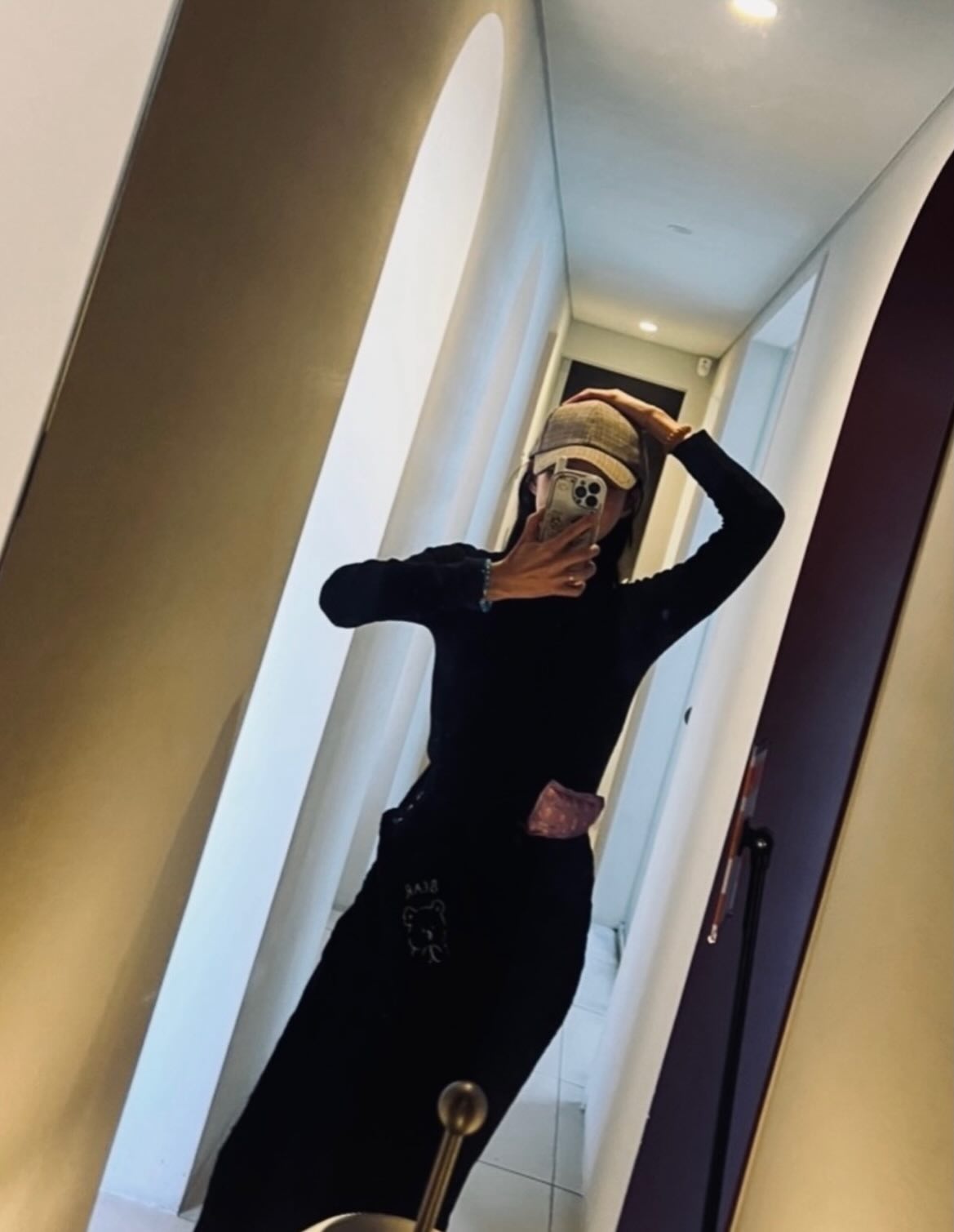 블랙 롱슬리브 탑과 와이드 팬츠로 구성한 올블랙 코디는 심플하지만 존재감이 확실하다. 허리에 멘 핑크 파우치가 강렬한 블랙 베이스에 사랑스러운 반전을 선사하고, 베이지 버킷캡이 전체적인 캐주얼 무드를 완성해준다. 화이트 워치 하나로 포인트를 마무리하는 세련된 감각이 돋보인다.