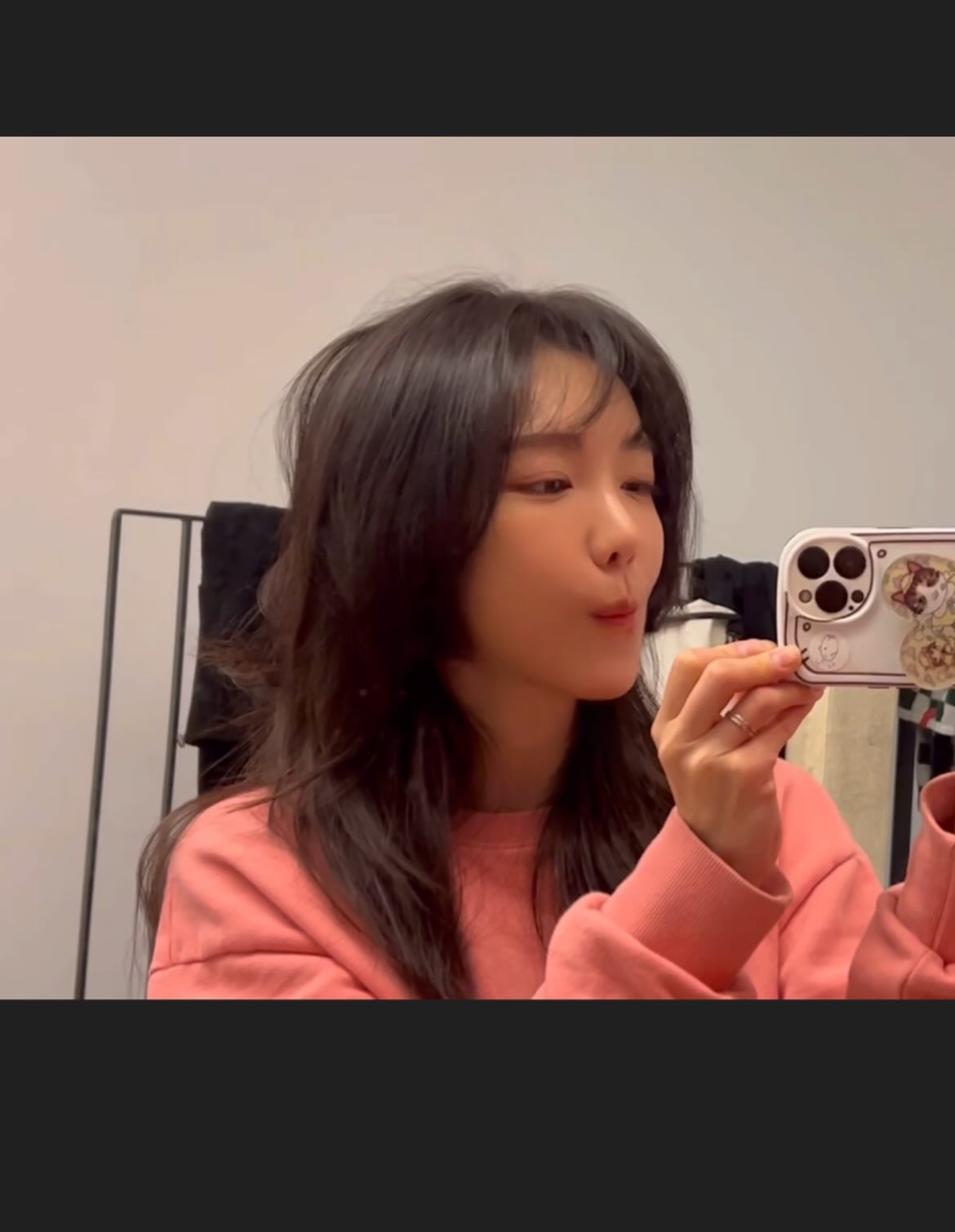 파스텔 핑크 오버핏 스웨트셔츠와 찰랑이는 롱 웨이브 헤어의 조합이 청순하고 귀여운 분위기를 만들어낸다. 단발로 변신하기 전 마지막 긴 머리를 기록한 셀피로, 소녀 같은 표정과 핑크 컬러가 시너지를 이뤄 더욱 사랑스러운 룩이 완성됐다.