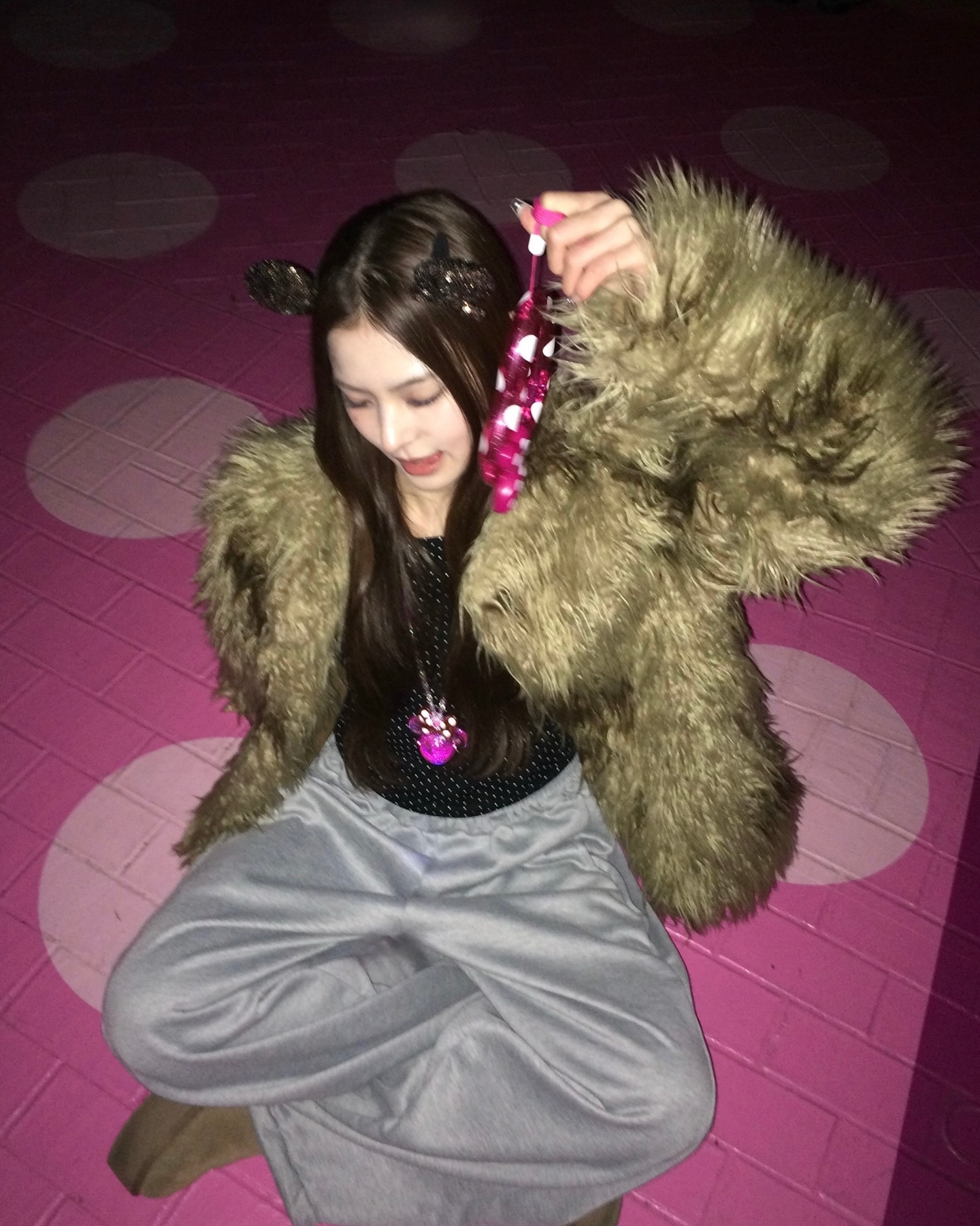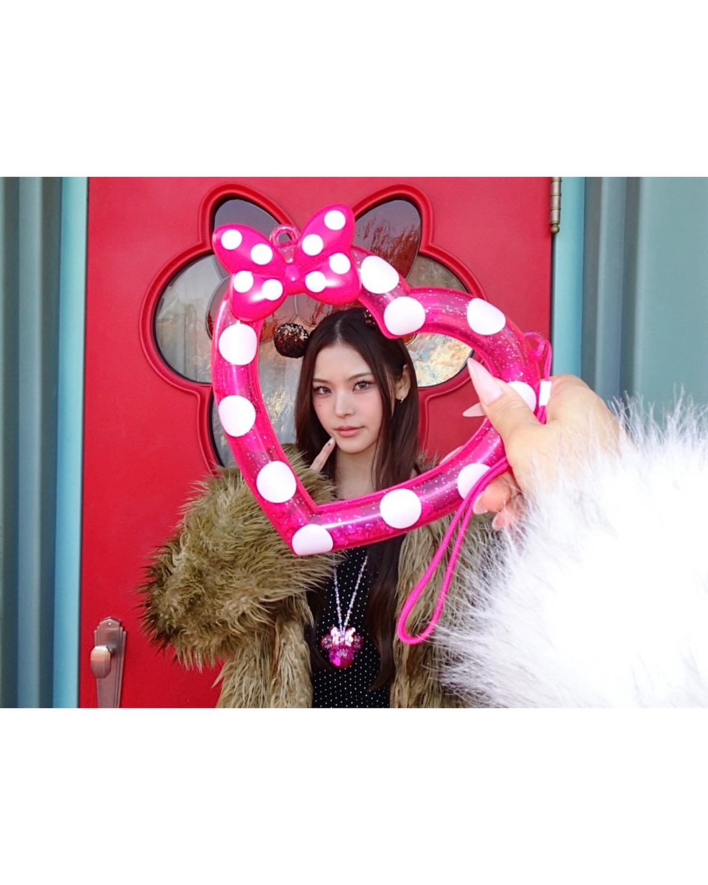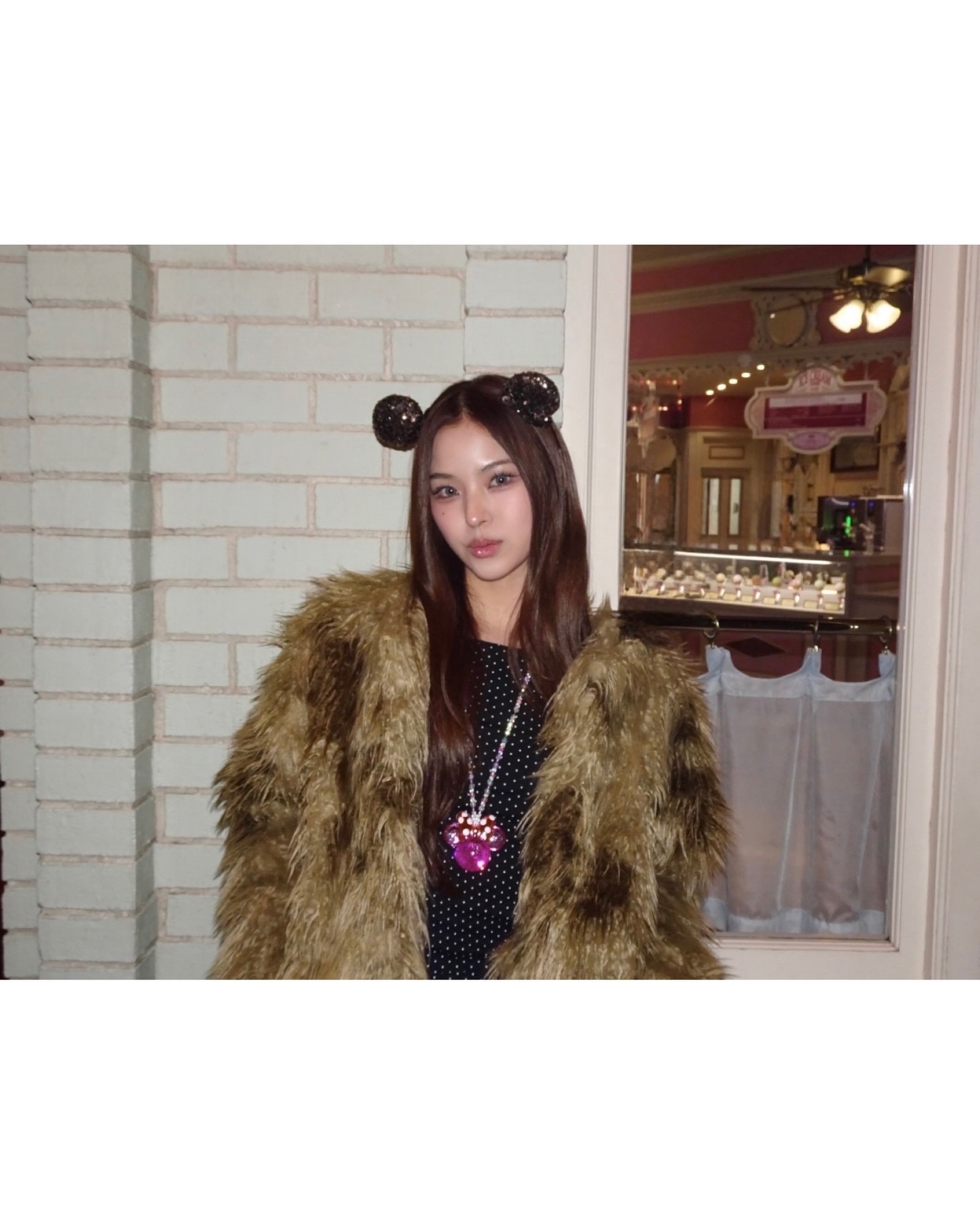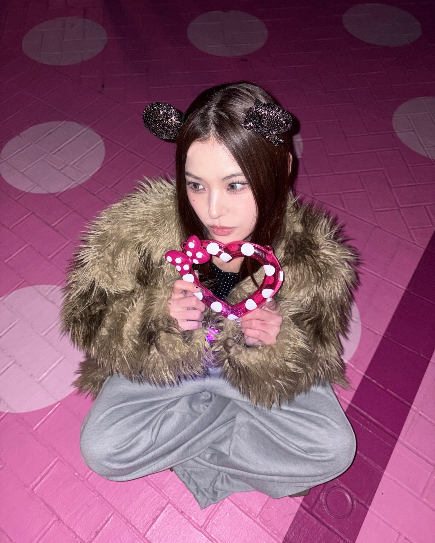 이즈나 마이는 미니마우스 귀 머리띠와 핑크 하트 프레임 같은 테마파크 굿즈를 브라운 퍼 자켓과 조합해 관광객 룩을 완전히 탈피했어요 🐻 아이돌답지 않게 소품을 오히려 무기로 삼아 전체 룩에 하이엔드 감성을 부여한 점이 인상적입니다. 핑크와 브라운이라는 예상 밖의 컬러 조합도 마이의 날카로운 마스크 덕분에 찰떡으로 소화되었어요 💫