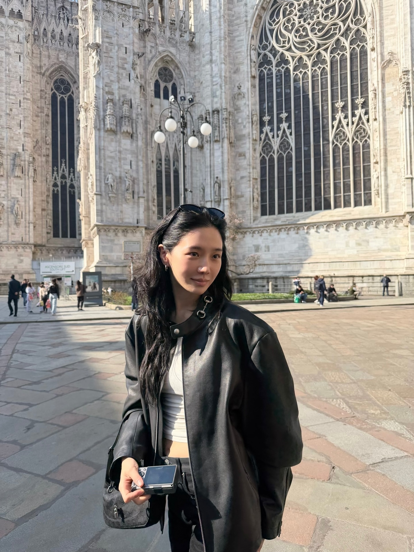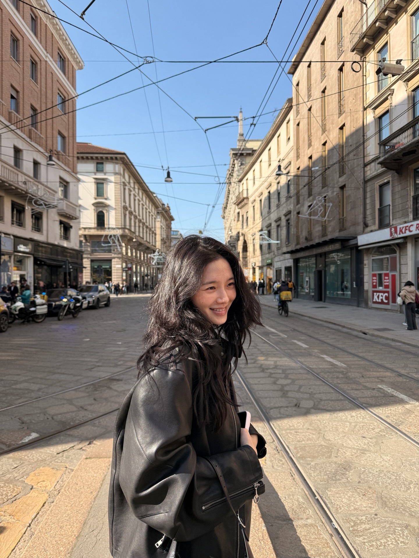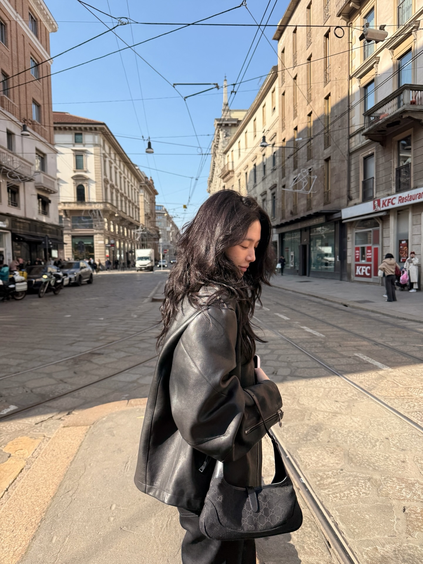 트램 선로 위의 박규영, 레더 재킷으로 밀라노를 접수 🖤