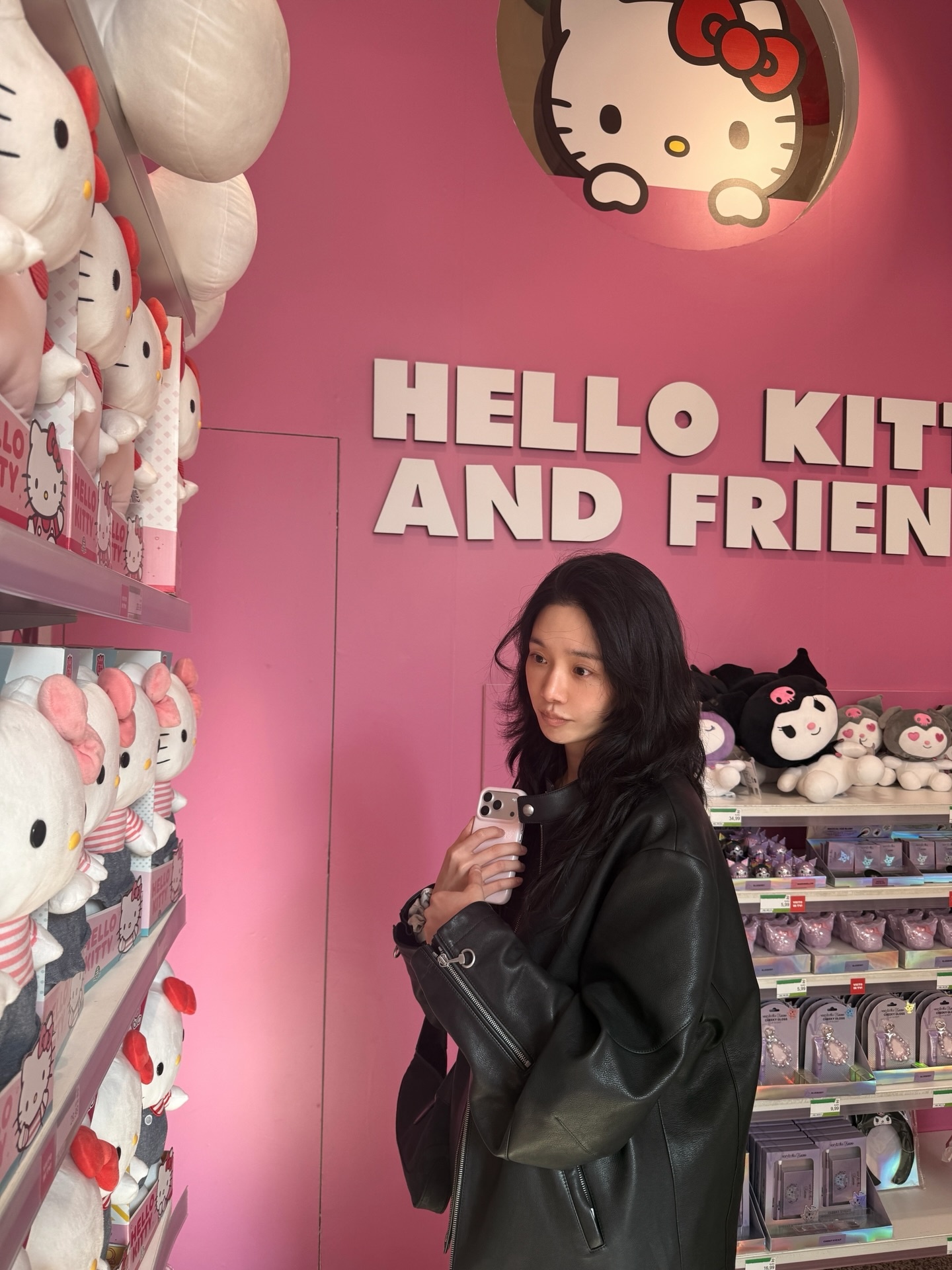 이번 코디의 숨은 주인공은 단연 화이트 크롭 탑이에요 🤍! 두꺼운 레더 재킷 안에 짧게 잘린 흰 이너를 매치해 복부 라인이 살짝 드러나게 하니까 전체 실루엣에 경쾌한 리듬이 생겼거든요. 뻣뻣하고 무거울 것만 같은 레더 재킷이 이렇게 가볍고 발랄하게 소화된다는 게 신기 👏. 게다가 핑크빛 헬로키티 숍 앞에서 찍은 컷은 레더 특유의 쿨한 무드와 강렬한 핑크 배경이 묘하게 조화를 이뤄서 눈을 뗄 수가 없었어요!