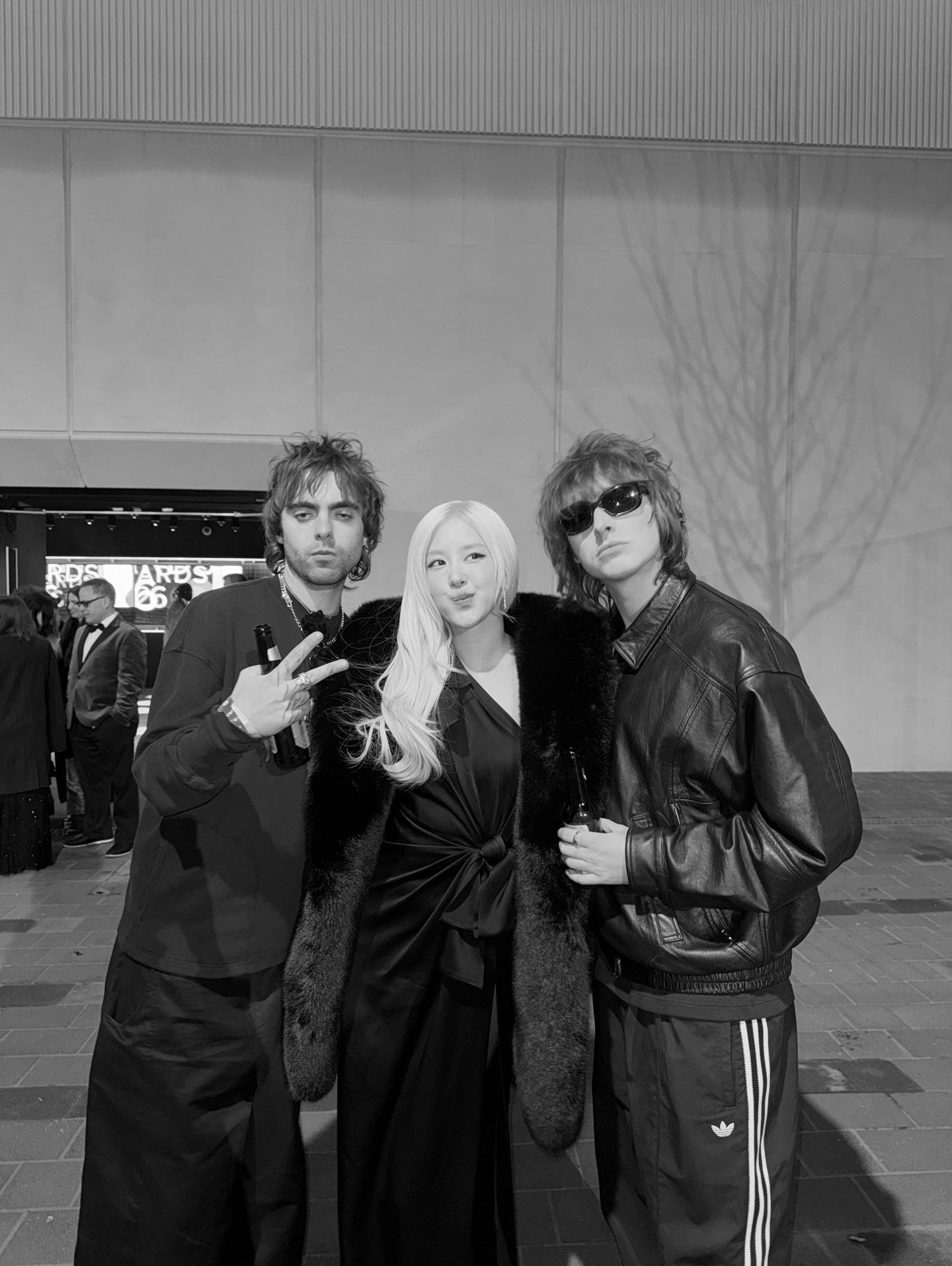시상식장 복도부터 런웨이가 된다. 로제가 선택한 블랙 퍼 코트는 그 자체로 압도적이었지만, 코트 사이로 살짝 드러나는 화이트 슬립 드레스와 블랙 리본 디테일이 진짜 핵심이었다. 거기에 손에 들린 커피 컵 하나가 '힙한 소품'으로 기능하는 것, 바로 로제만이 가능한 무드다. 묵직한 퍼와 가벼운 실크의 소재 대비가 이날 룩 전체의 키워드를 예고했다.