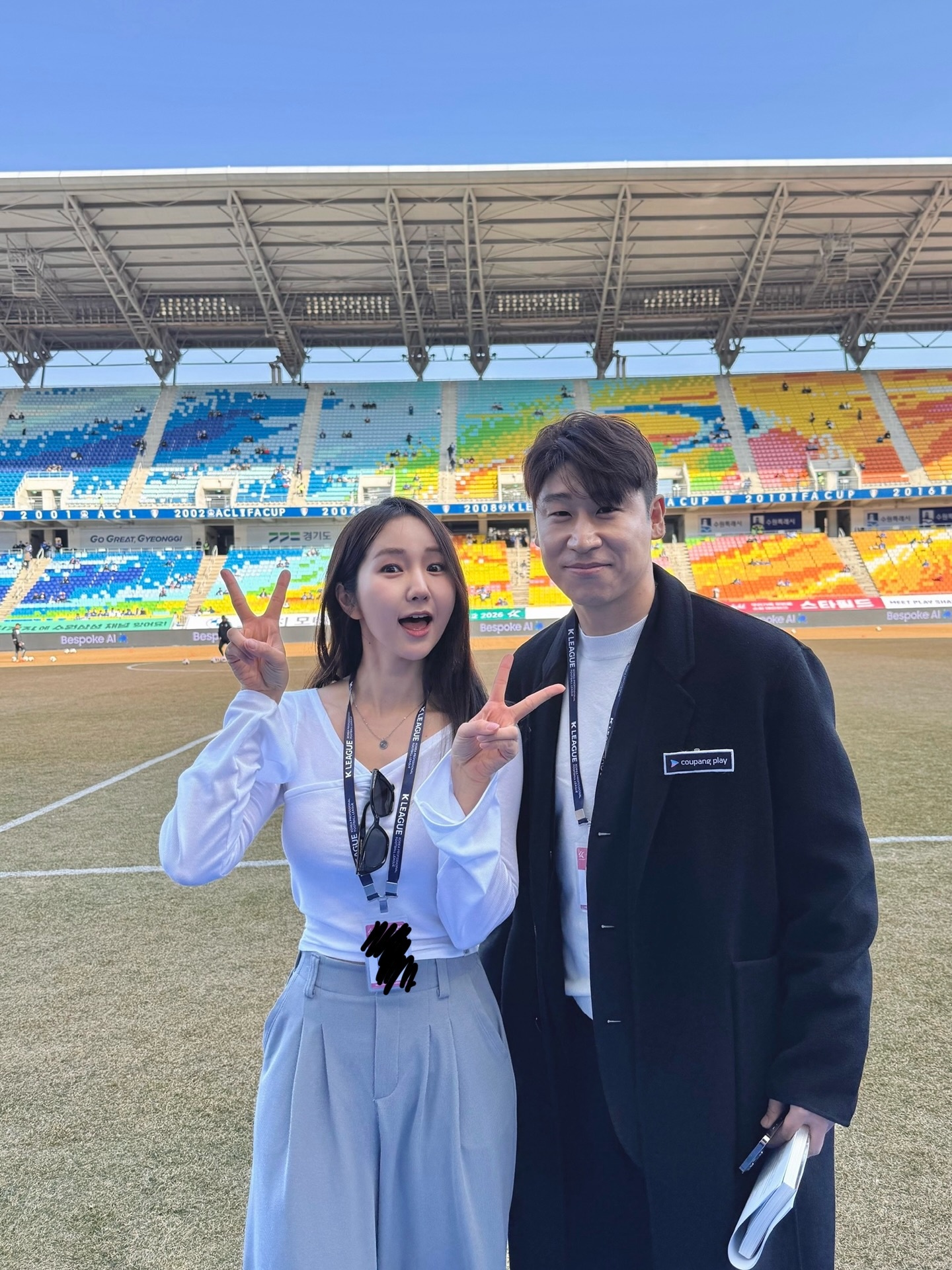 수원 그라운드에 직접 내려간 박지혜 아나운서는 화이트 크롭 롱슬리브와 파스텔 블루 와이드 슬랙스 조합으로 시원하고 청량한 분위기를 연출했습니다. 수원 삼성의 팀 컬러인 블루를 자연스럽게 녹여낸 센스 있는 컬러 선택이 눈에 띄었는데요. 목에 가볍게 걸쳐 놓은 선글라스 디테일 하나가 전체 코디를 한층 업그레이드시켜 주었습니다. 밝은 미소와 함께 쌍 V포즈를 취한 그라운드 인증샷은 팬들 사이에서 큰 화제를 모았습니다.