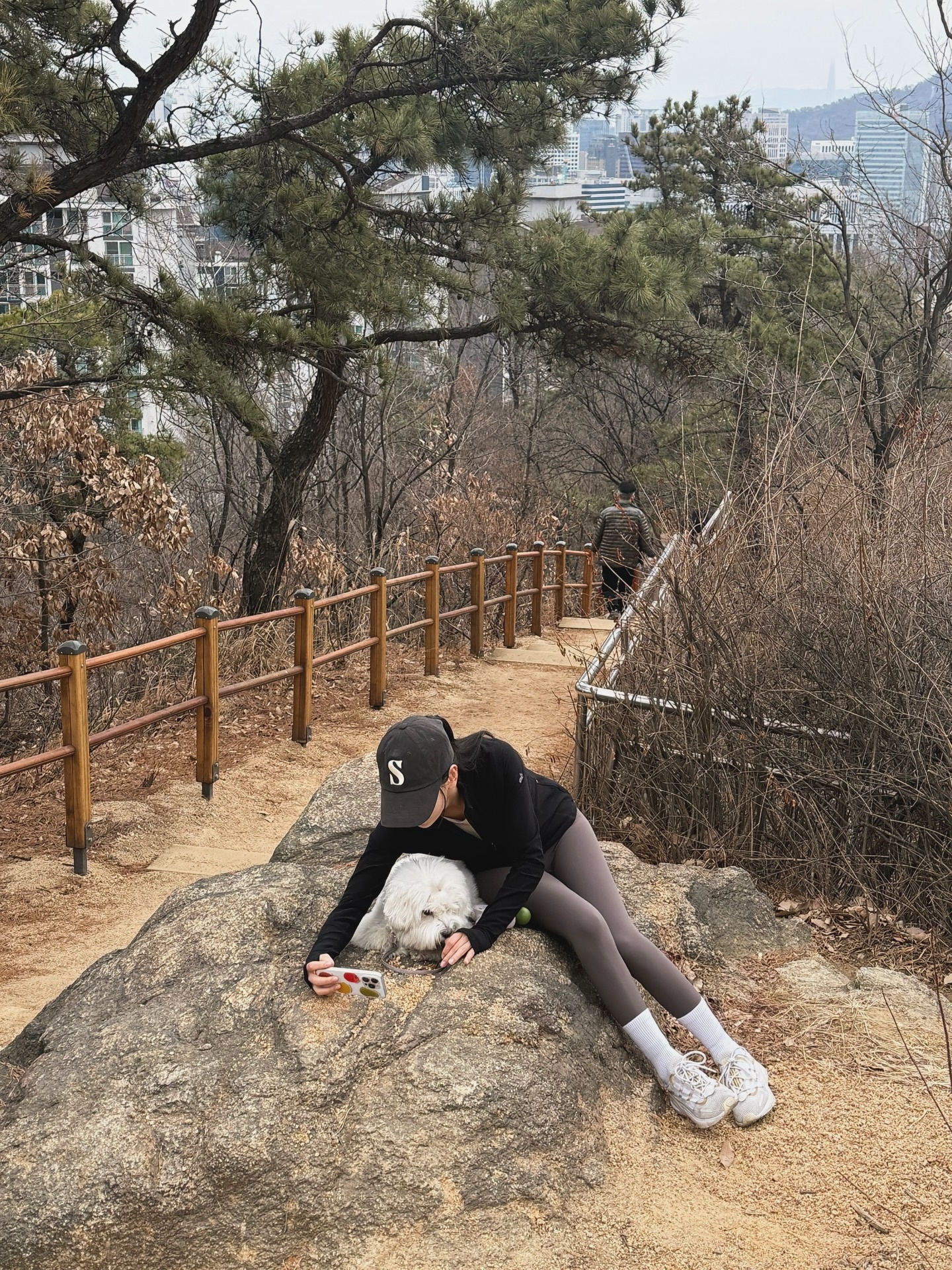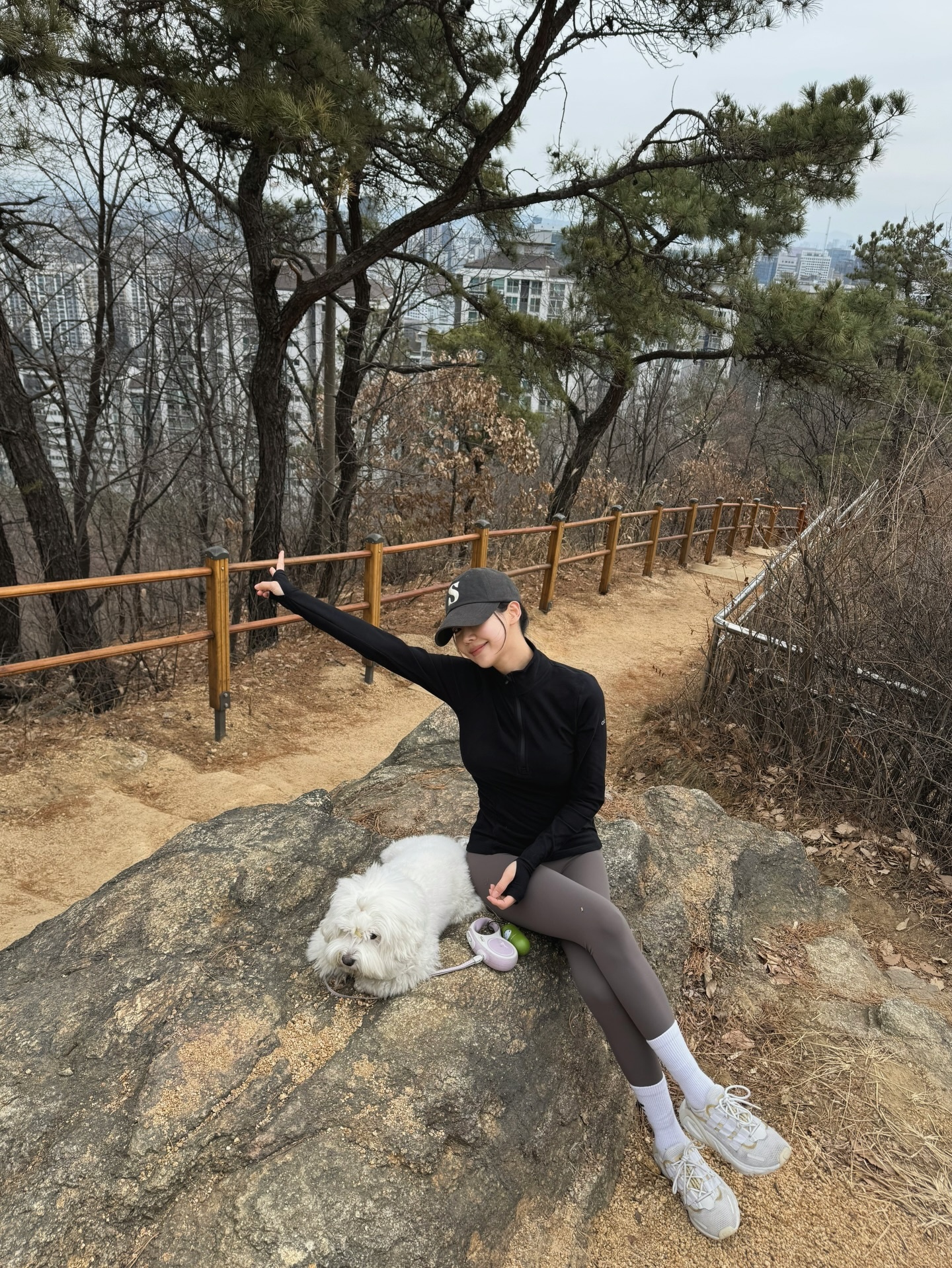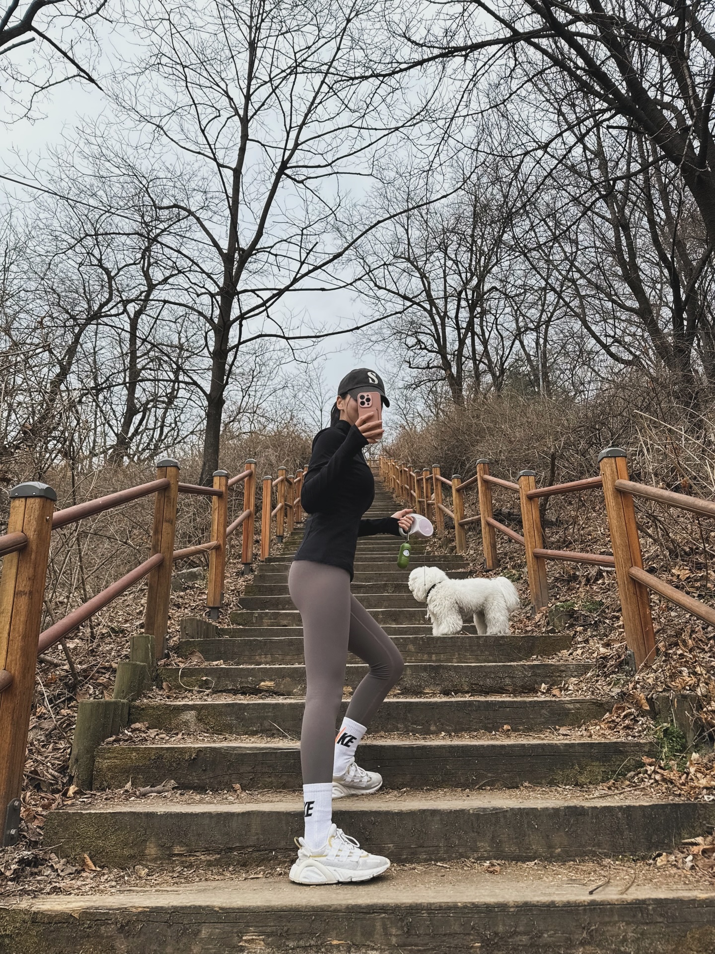 다크 톤 코디에 생동감을 더해준 비밀 무기는 다름 아닌 화이트 삭스와 스니커즈랍니다 🤍 레깅스 위로 올려 신은 흰 양말이 다리를 길어 보이게 하면서 스포티한 느낌을 살려줘요. 옆에서 함께하는 새하얀 비숑과 자연스레 톤 매칭이 되는 것도 너무 사랑스럽죠? 😍