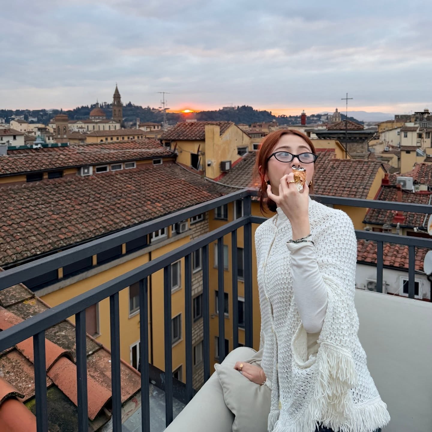 저녁노을이 내려앉은 피렌체 루프탑, 허윤진의 마지막 룩이 여기서 탄생했어요 🌅 루즈하게 걸친 화이트 니트 케이프에 블랙 뿔테 안경만 더했을 뿐인데, 이게 진짜 '꾸안꾸'의 완성형이 아닐까요? 손에 쥔 화려한 골드 주얼리 링이 전체 코디에 럭셔리한 마침표를 찍어주고요. 허윤진이 펜디 쇼 전에 보여준 일련의 스타일들은 클래식이 어떻게 새롭게 재해석될 수 있는지 완벽하게 증명하고 있어요 💛