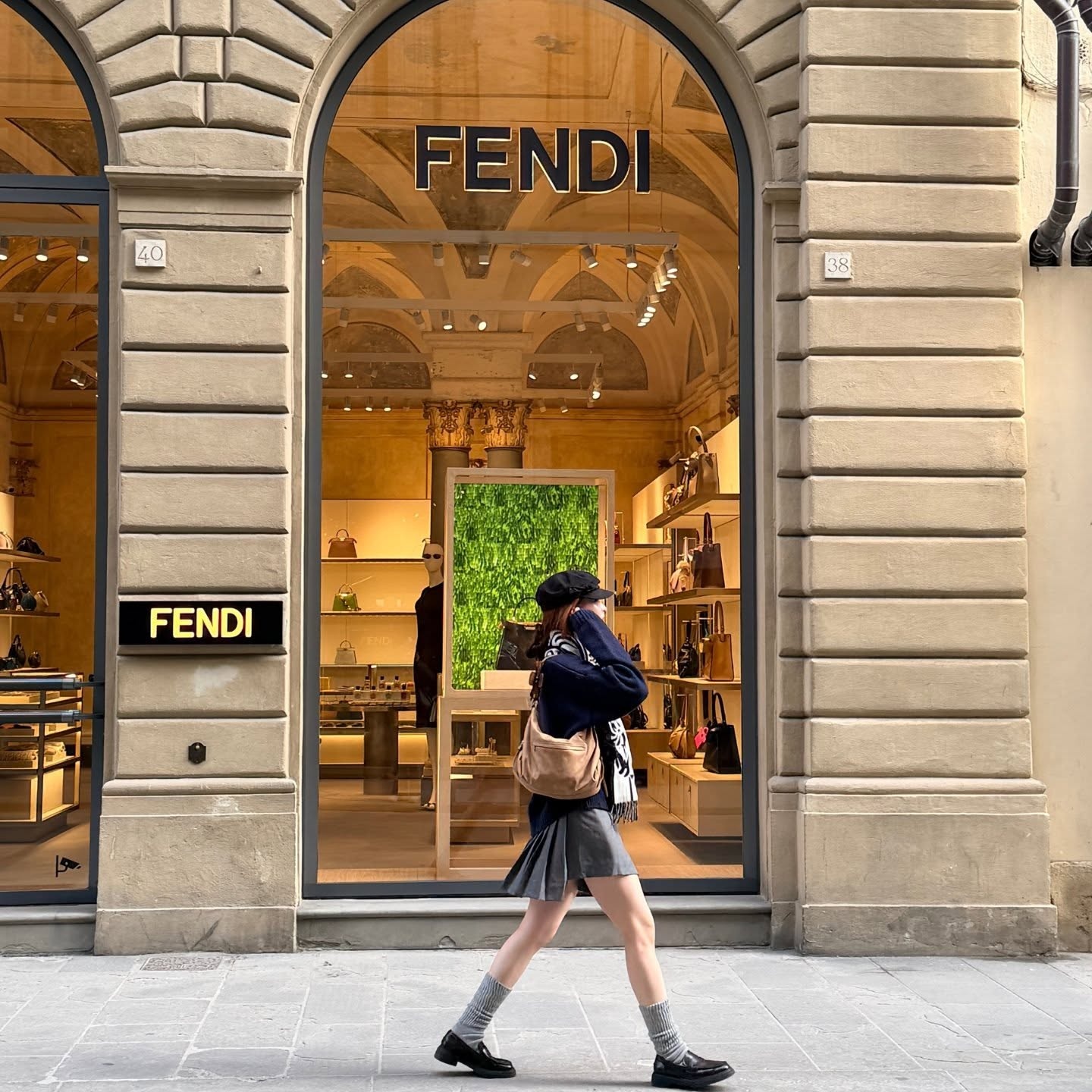 허윤진 피렌체 룩의 주인공은 단연 그레이 플리츠 미니스커트랍니다 🎒 프레피 무드의 대표 아이템이지만, 두툼한 네이비 니트와 굵직한 로퍼를 함께 스타일링해 촌스러움 없이 세련되게 완성했어요. 펜디 부티크를 배경으로 걸어가는 모습에서 슬쩍 보이는 그레이 삭스+로퍼 조합은 이탈리아 클래식 무드에 서울 스트릿 감각을 절묘하게 섞어놓은 느낌이에요 ✨ 캡 모자와 루즈한 백팩이 더해지며 진짜 '꾸안꾸' 완성!
