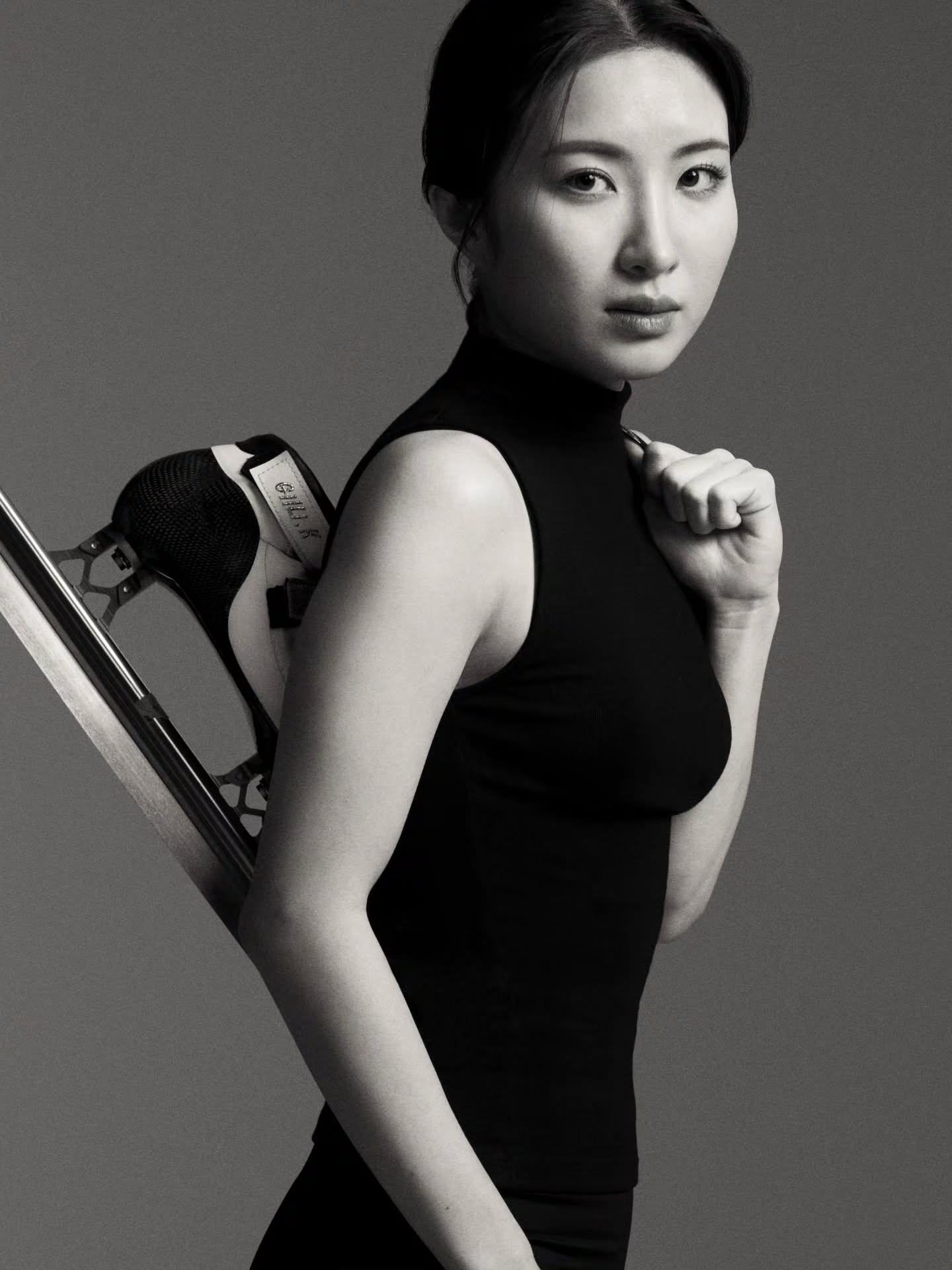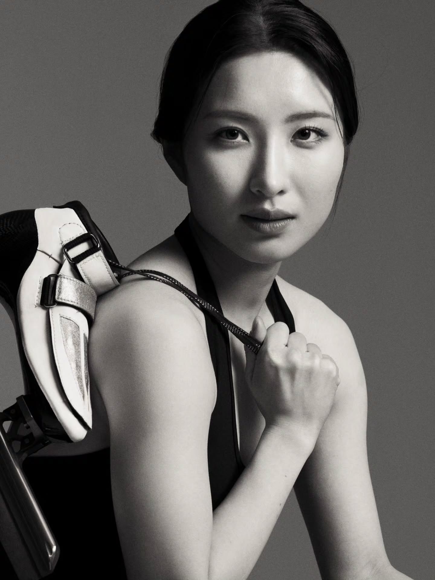 어깨 위에 자연스럽게 걸쳐진 스케이트 화는 단순한 소품이 아닙니다. 그것은 금메달의 무게와 서사를 상징하는 오브제입니다. 블랙 슬리브리스가 탄탄한 어깨 라인을 고스란히 드러내며, 스포츠와 하이패션 사이의 경계를 유연하게 지워냅니다. 운동선수의 절제된 포즈 위에 샤넬 특유의 럭셔리 감성이 포개져 완전히 새로운 '스포티 럭셔리'를 완성합니다.