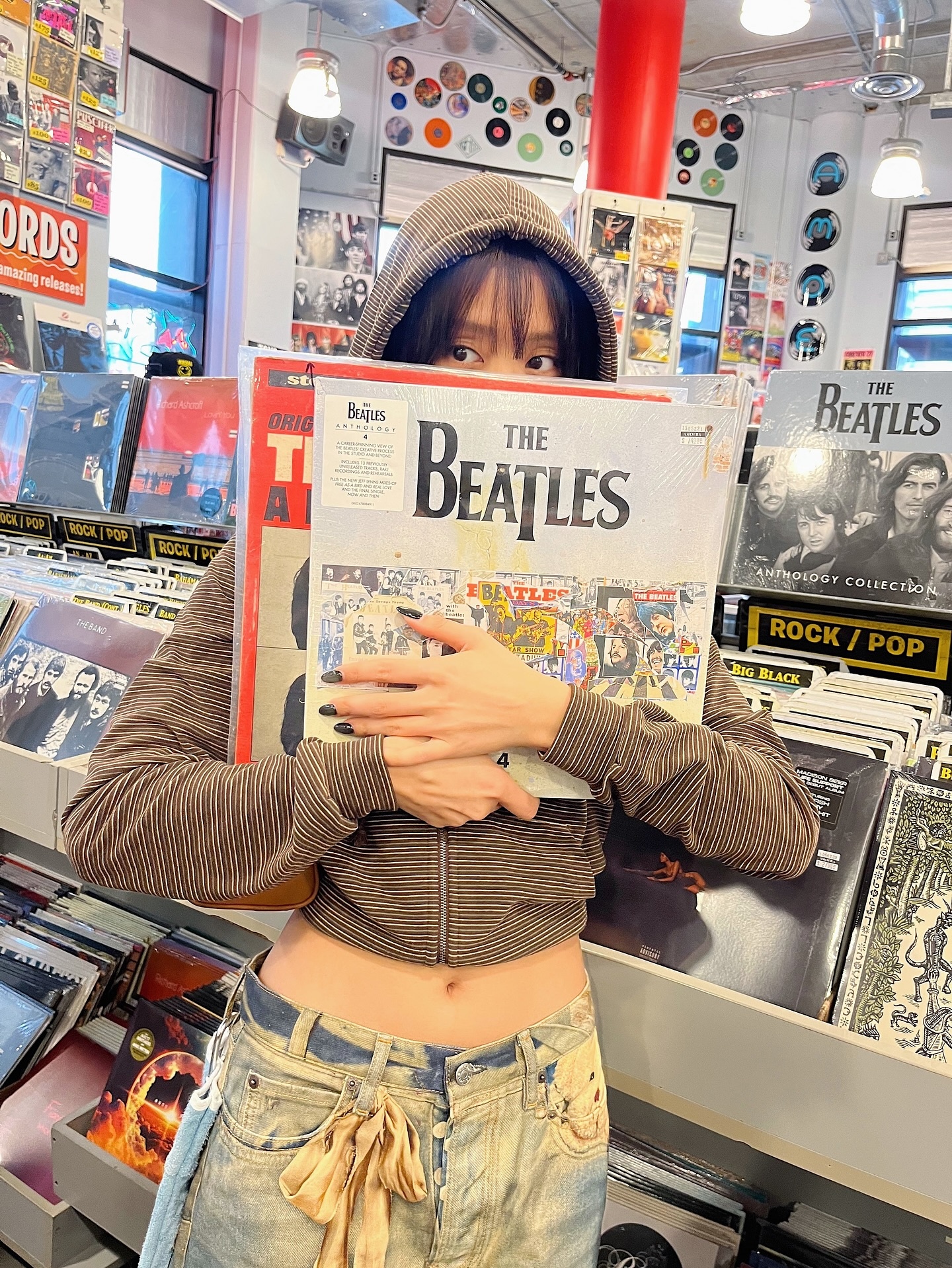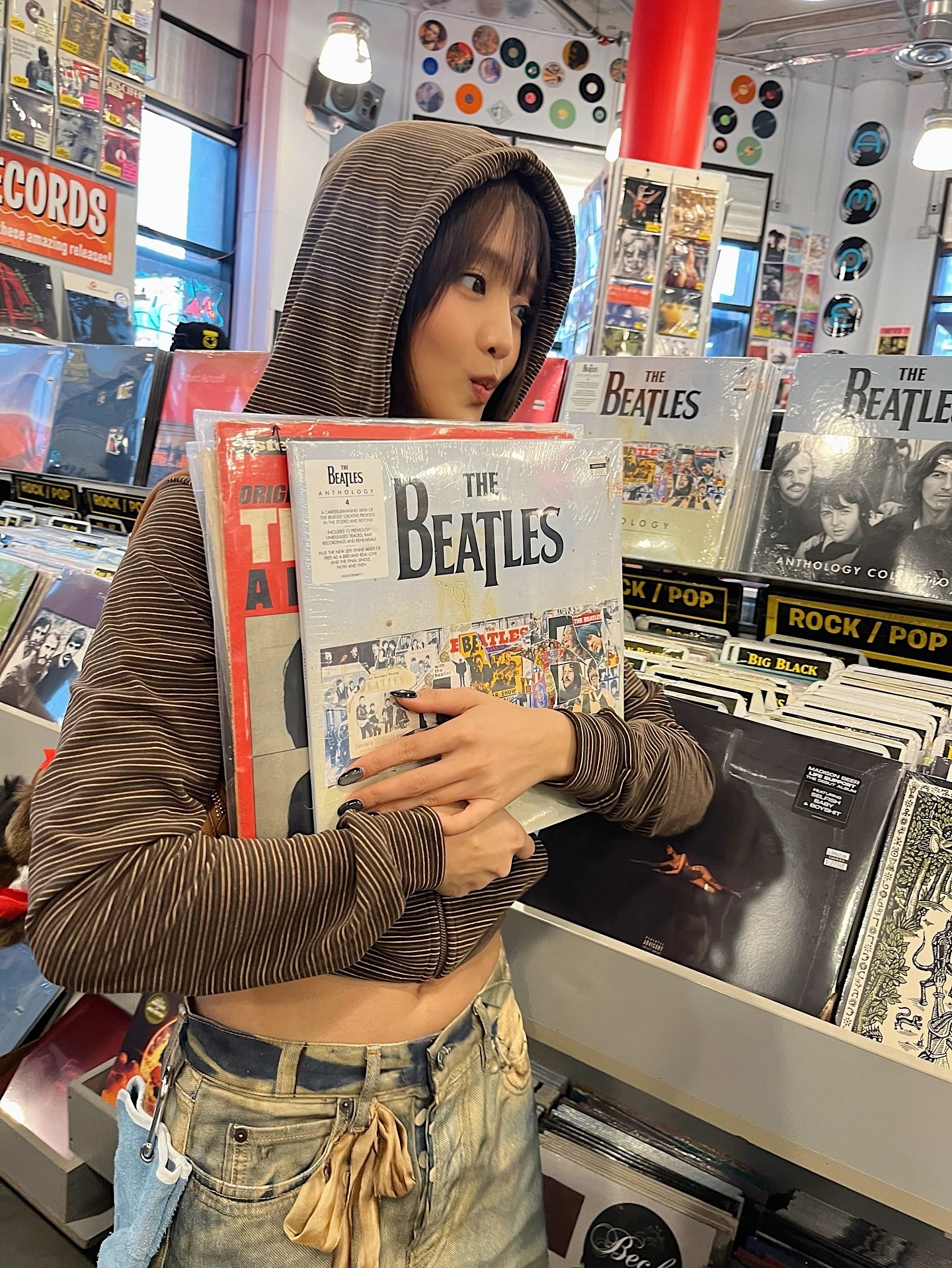 LA에서의 민니 일상 중 LP 레코드샵 방문 사진도 화제예요 🎵 'Essential Records' 샵에서 비틀즈 앨범을 두 손으로 꼭 쥐고 얼굴을 가린 위트 있는 포즈가 팬들 사이에서 큰 반응을 얻었는데요. 패치워크 데님룩에 크롭 후디를 입고 레코드샵을 누비는 민니의 모습은 '너드힙' 그 자체예요 😎 90년대 팝스타가 빈티지 숍을 털러 다니는 에너지랄까요? 민니만이 낼 수 있는 자유롭고 위트 넘치는 스트릿 감성이 이번 LA 나들이에서 제대로 발휘됐답니다 🎸