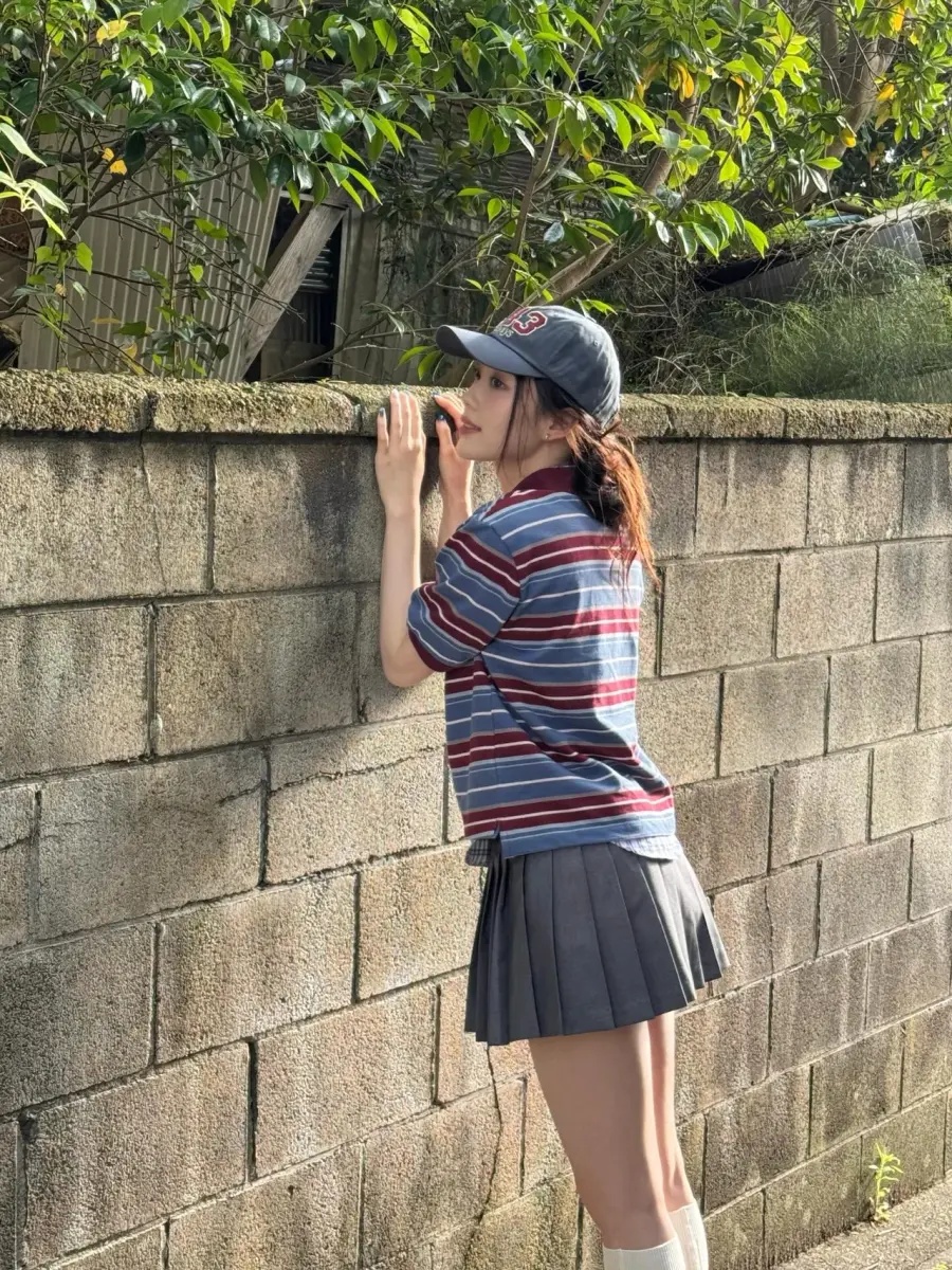이 룩의 핵심은 스트라이프 피케 셔츠 아래로 삐져나온 체크 셔츠 밑단입니다. 네이비·버건디·화이트가 교차하는 스트라이프 단품만으로도 충분히 멋지지만, 체크 패턴 한 겹을 더해 룩 전체에 경쾌한 리듬감을 더했어요. 짙은 그레이 플리츠 미니스커트로 하의를 깔끔하게 정리하면서 프레피 스쿨룩의 정석을 완성했습니다. 과하지 않되 확실하게 포인트를 주는 레이어링 실력이 돋보이는 코디예요.