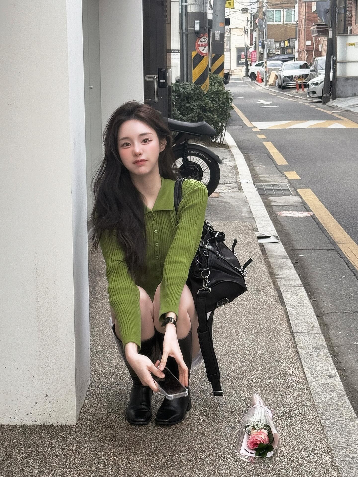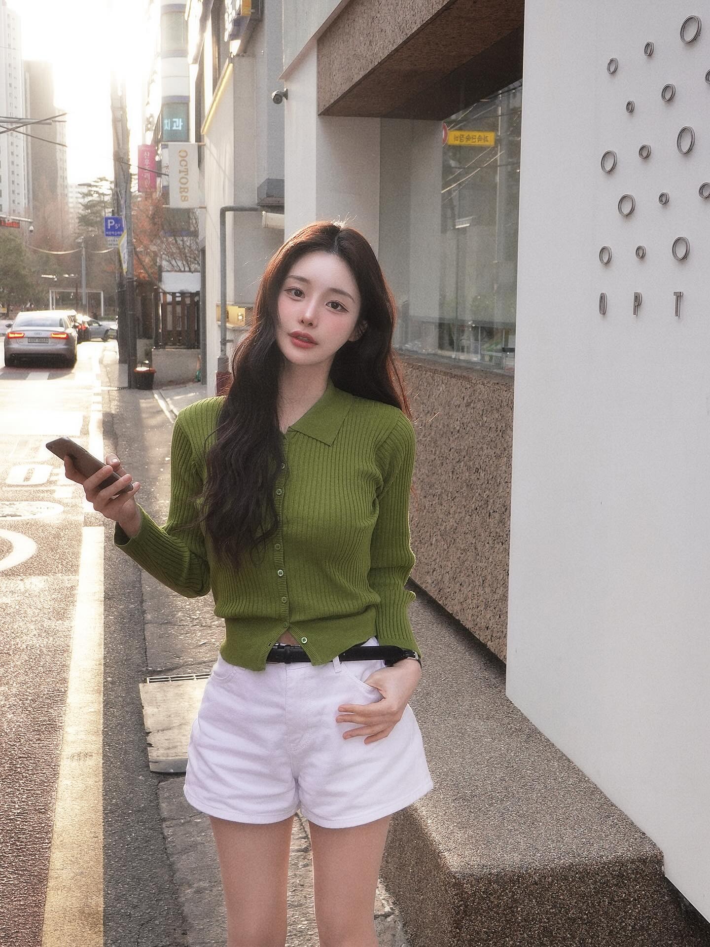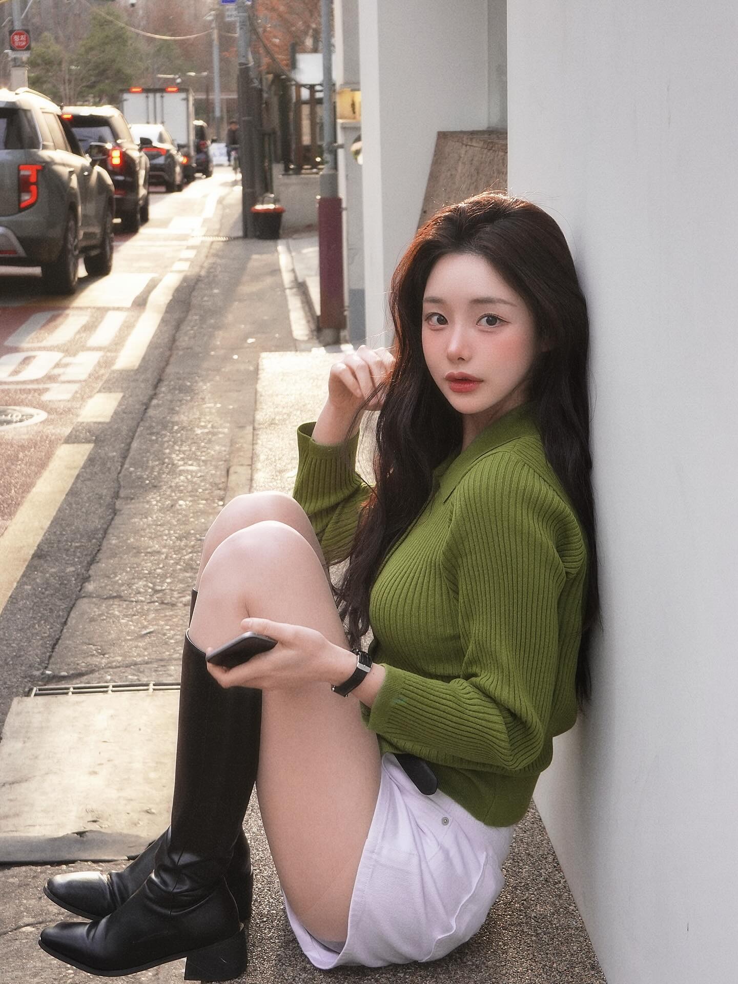 골목의 역광을 배경으로 찍힌 이 사이드뷰 컷, 정예진의 올리브 그린 코디가 빛을 받아 더욱 선명하게 살아나요 ☀️ 옆에서 봐도 니트의 볼드한 볼륨감과 화이트 쇼츠의 깔끔함이 살아있고, 블랙 롱부츠가 하체 라인을 탄탄하게 잡아줘요. 레이어링이나 과한 액세서리 없이 딱 세 가지 컬러 조합만으로 이 완성도를 만든 게 정예진 패션의 진짜 포인트예요 🌿 그린 니트 한 장을 화이트와 블랙 사이에 끼워 넣는 것, 이번 봄 꼭 한 번 시도해봐요!
