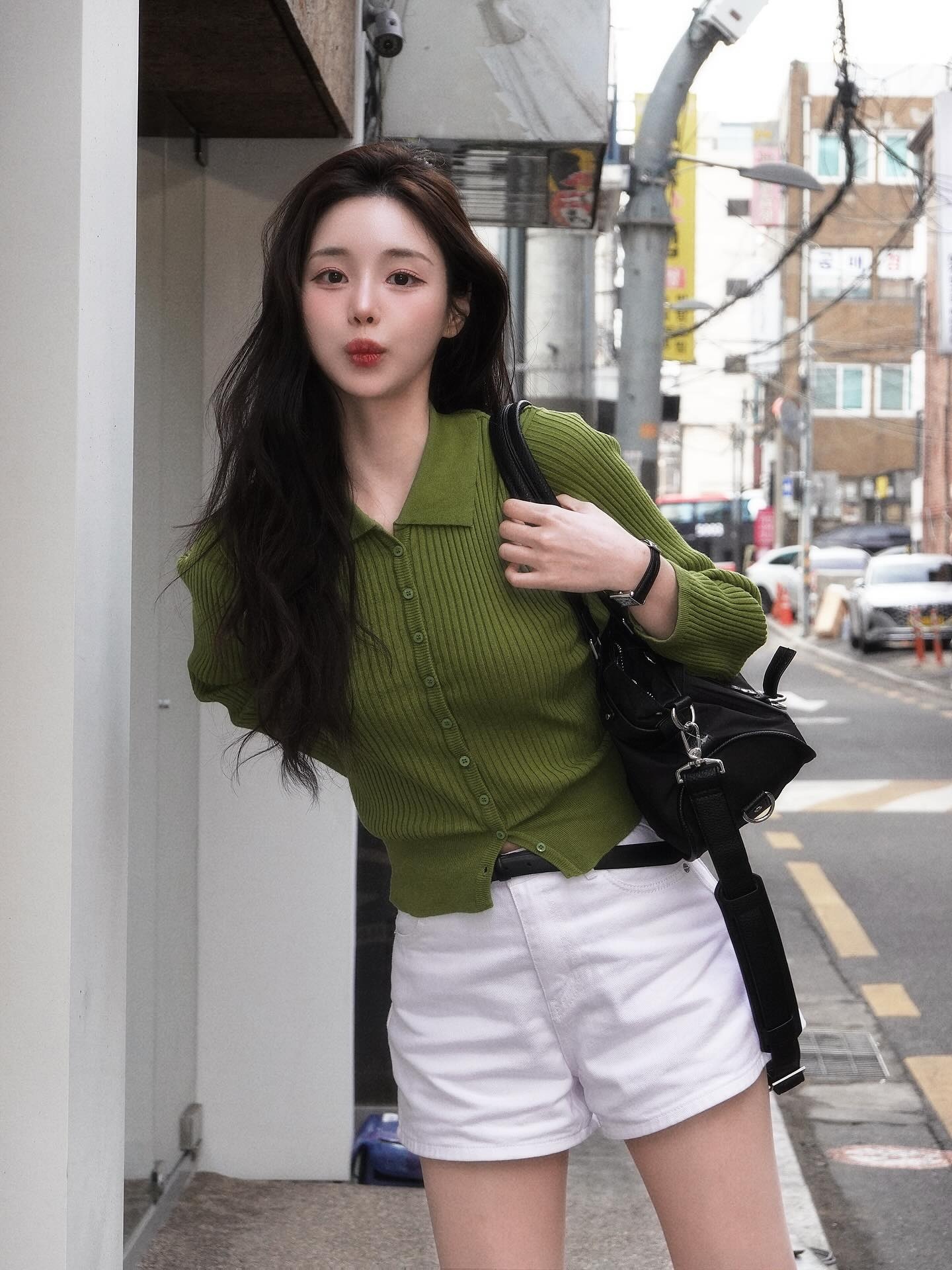 #정예진 #올리브그린니트 #봄코디 #골지니트카디건 #화이트쇼츠 #블랙롱부츠 #스키니벨트 #연예인패션 #봄패션코디 #스트리트룩