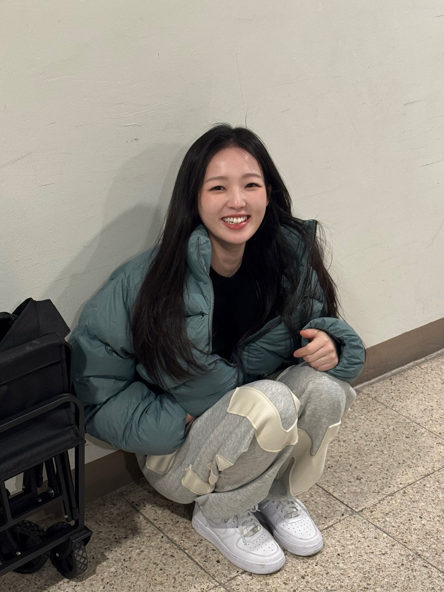 패딩에 조거 팬츠라니 편해 보이지 않을까요? 근데 김시현 코디 보시면 생각이 바뀔 거예요 😲 블루그린 오버핏 패딩에 크림 화이트 그래픽이 들어간 그레이 조거를 매치했는데, 색감이 자연스럽게 어우러지면서 세련됨이 살아있어요. 포인트는 패딩 볼륨이 클수록 와이드 팬츠로 균형을 잡아주는 것! 비율이 안정적으로 잡히면서 스타일이 훨씬 완성도 있게 보여요 💙