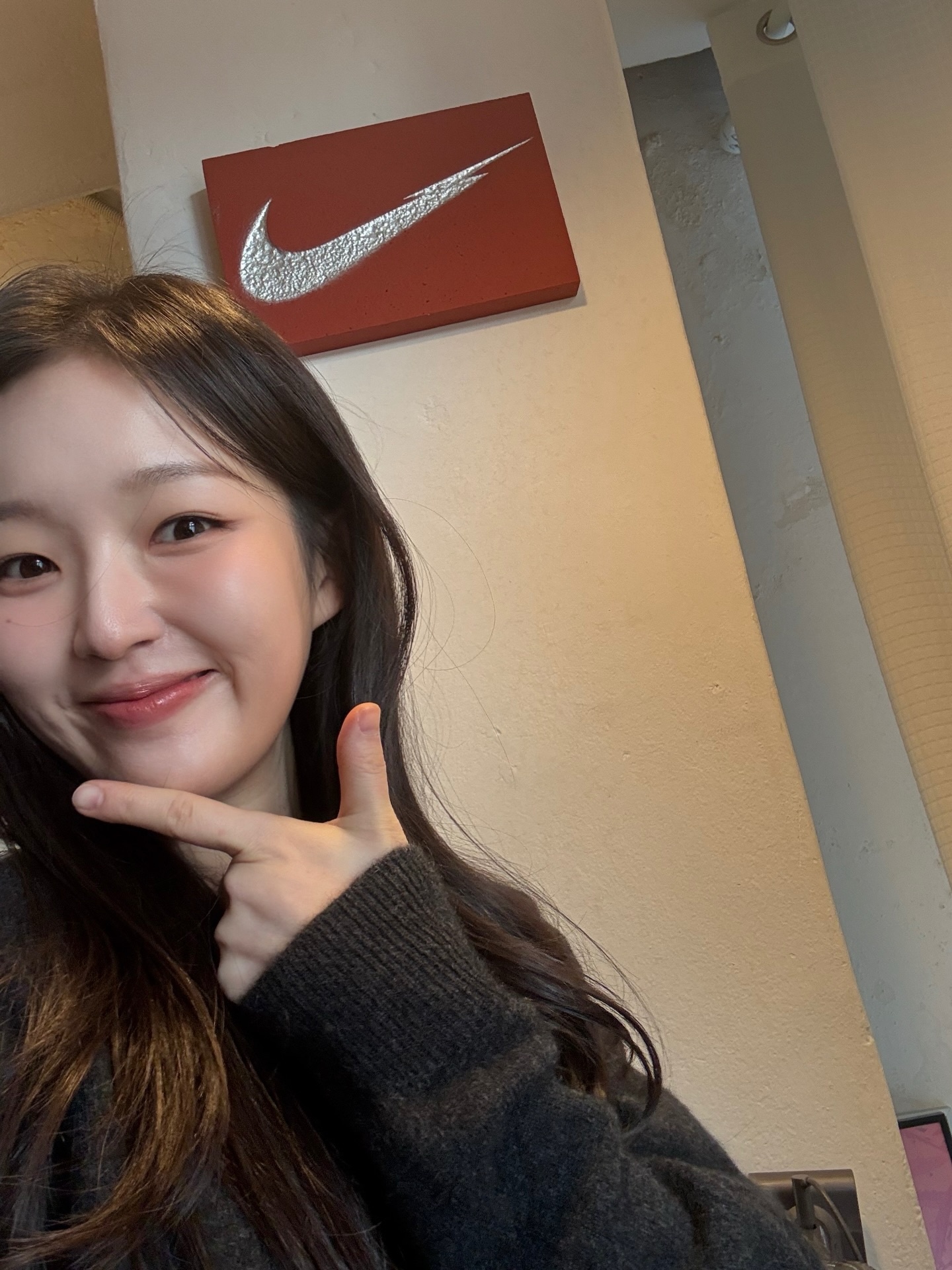 📷 나이키 포스터가 걸린 아늑한 공간에서 블랙 오버핏 패딩을 입고 브이 포즈를 취한 김시현 / 김시현 인스타그램 @_hyeonsi