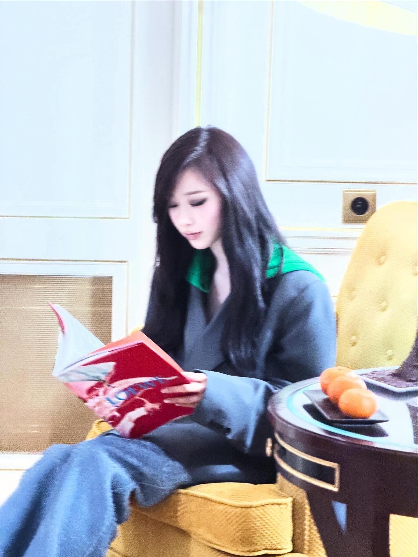 야외 사진만이 아니다. 황금빛 벨벳 소파에 앉아 Loewe 북을 읽는 컷은 같은 코디가 완전히 다른 무드를 만들어낸다는 걸 보여준다. 파리라는 공간, Loewe라는 브랜드, 그레이×그린×블루의 색감이 모두 하나로 어우러진 장면이다. 브랜드 앰배서더로서의 면모가 이 한 장에 담겨 있다.