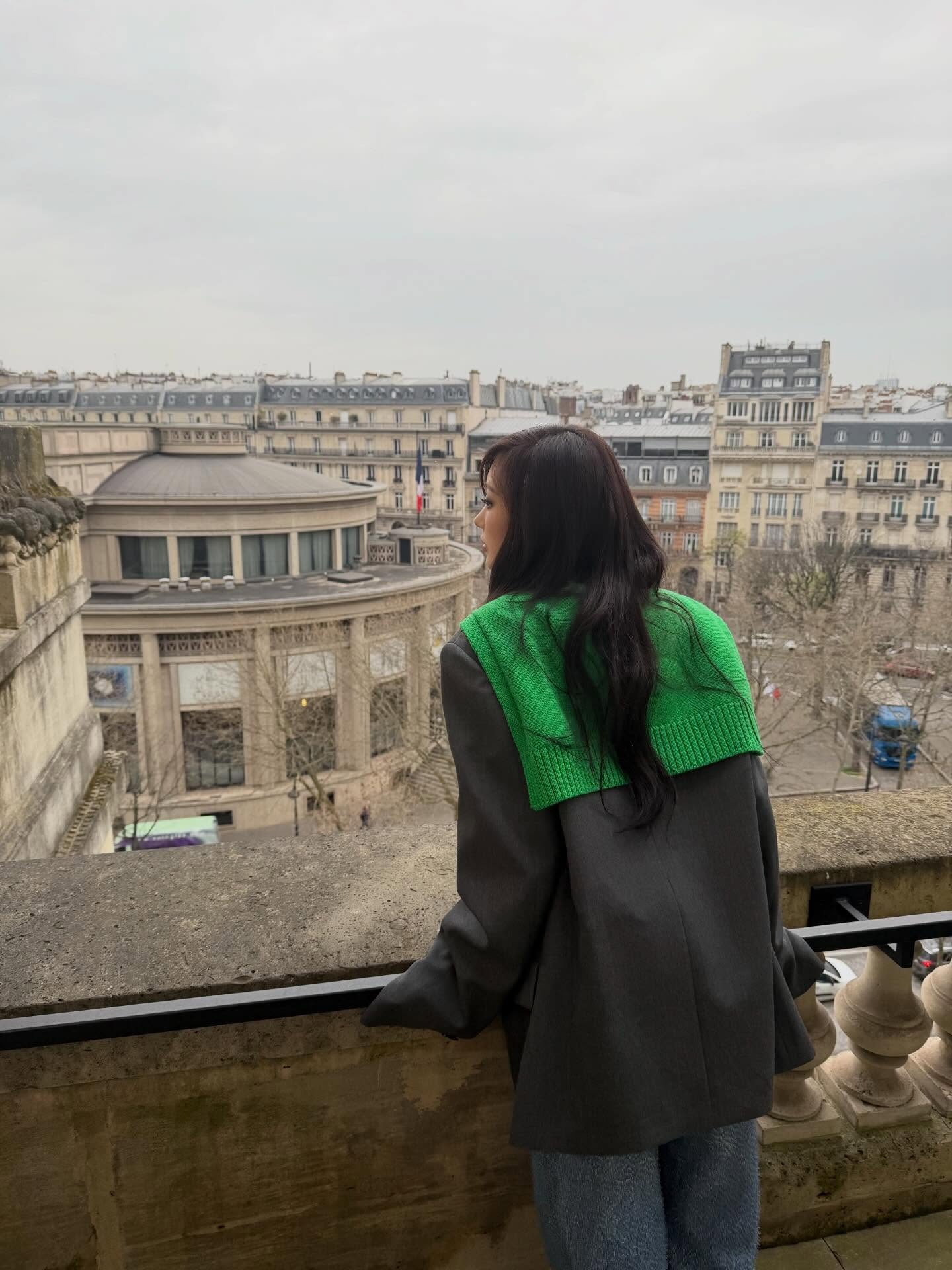 그레이 아우터가 있다면 지금 당장 꺼내서 안에 그린 니트를 더해보세요. 지젤이 파리에서 직접 증명한 가장 쉽고 확실한 무채색 코디 업그레이드 방법이에요!