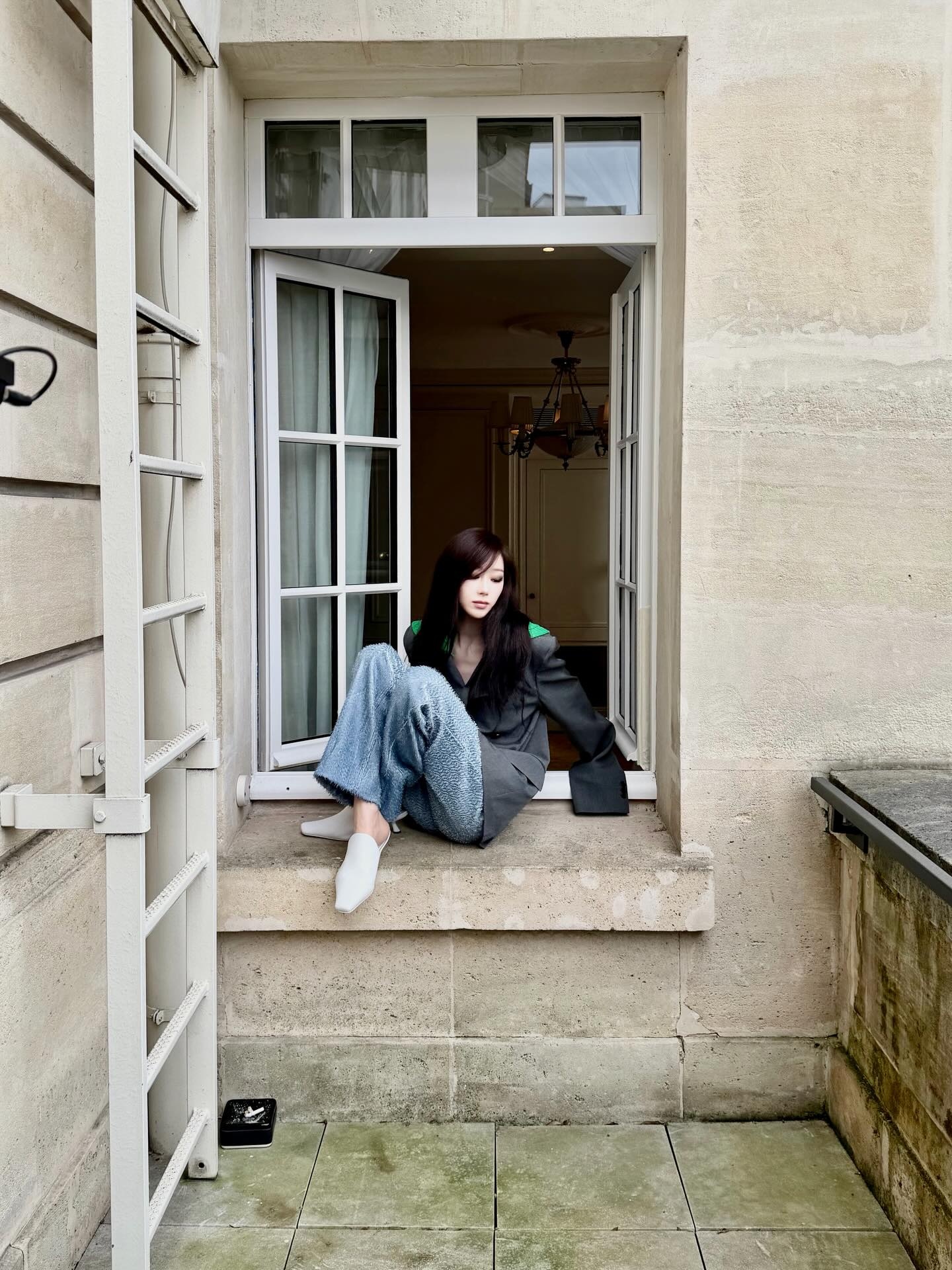 오버사이즈 재킷은 잘못 입으면 실루엣이 무너지기 쉬운데, Loewe 이 재킷은 더블 버튼과 벨트 디테일 덕분에 볼륨이 있으면서도 허리 라인이 살아있다. 재킷을 고를 때 이 디테일 하나만 확인해도 성공 확률이 확 높아진다. 안에 크롭 니트나 터틀넥을 레이어드하면 칼라 주변으로 색감이 드러나면서 단조로운 재킷 코디에 활기가 생긴다. 파리 발코니를 배경으로 한 뒷모습도 실루엣 하나로 완성된다.