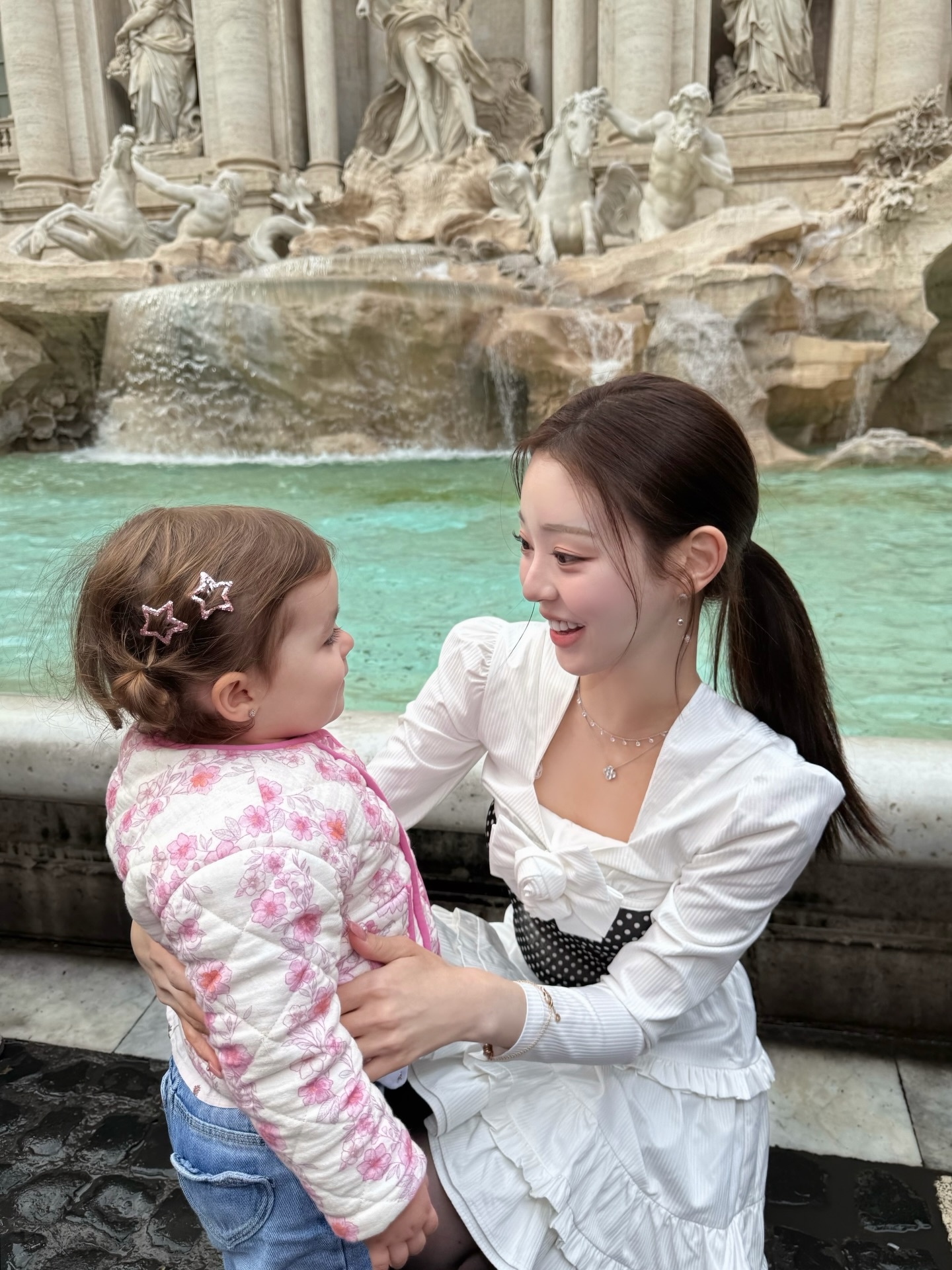 로마에서 가장 유명한 포토 스폿인 트레비 분수 앞에서 유시은은 도트 뷔스티에와 화이트 프릴 미니스커트, 블랙 타이즈의 조합으로 두 번째 패션 챕터를 열었습니다. 분수의 에메랄드빛 물과 유백색 프릴이 만들어내는 색 대비가 사진 속 전체 화면을 더욱 생동감 있게 만들고, 스커트 자락을 살짝 들어 보이는 포즈에서 자연스러운 발랄함이 묻어납니다. 우연히 만난 금발 아이와 교감하는 따뜻한 장면도 포착되어 더욱 인상적입니다.