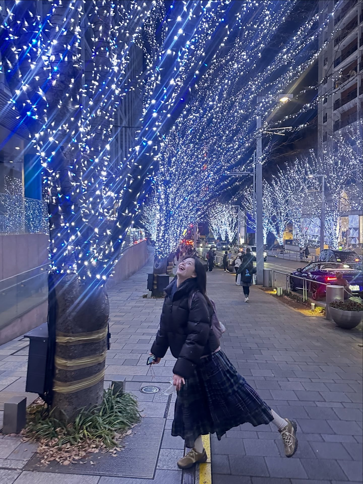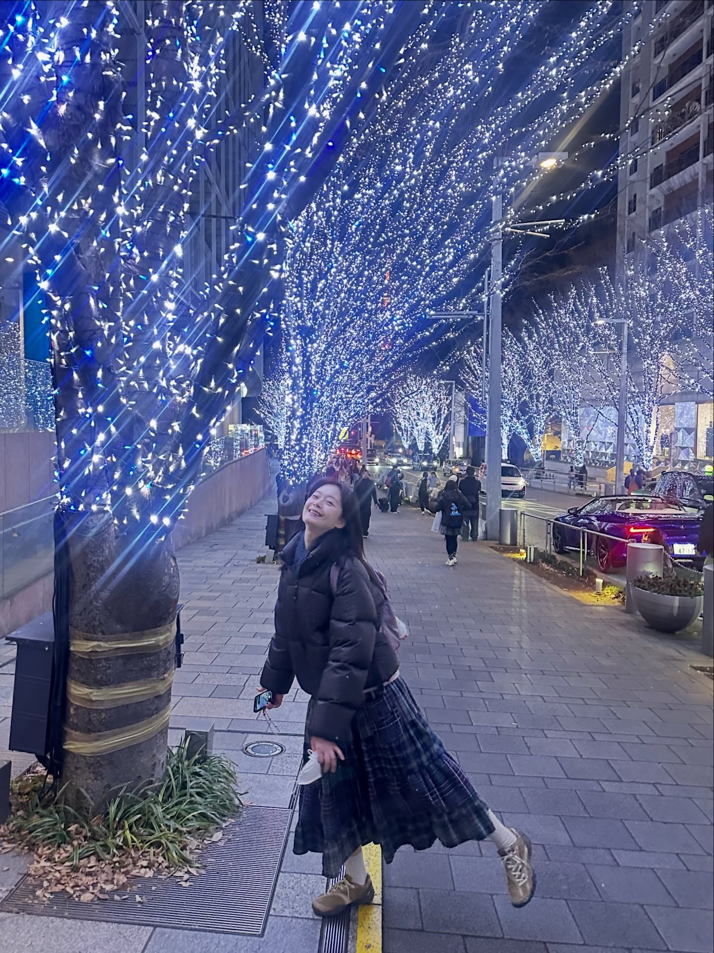 밤하늘로 솟은 대형 크리스마스 트리 앞에서 팔을 활짝 벌린 모습입니다. 블랙 패딩과 체크 롱스커트가 화려한 트리 조명을 배경으로 더욱 돋보이고, 흰 비니가 얼굴을 밝게 감싸줍니다. 회전하듯 자유롭게 포즈를 잡은 전소민의 표정에서 여행의 설렘이 그대로 느껴지네요. 화보가 아닌 진짜 순간이 더 빛나는 스타일입니다.