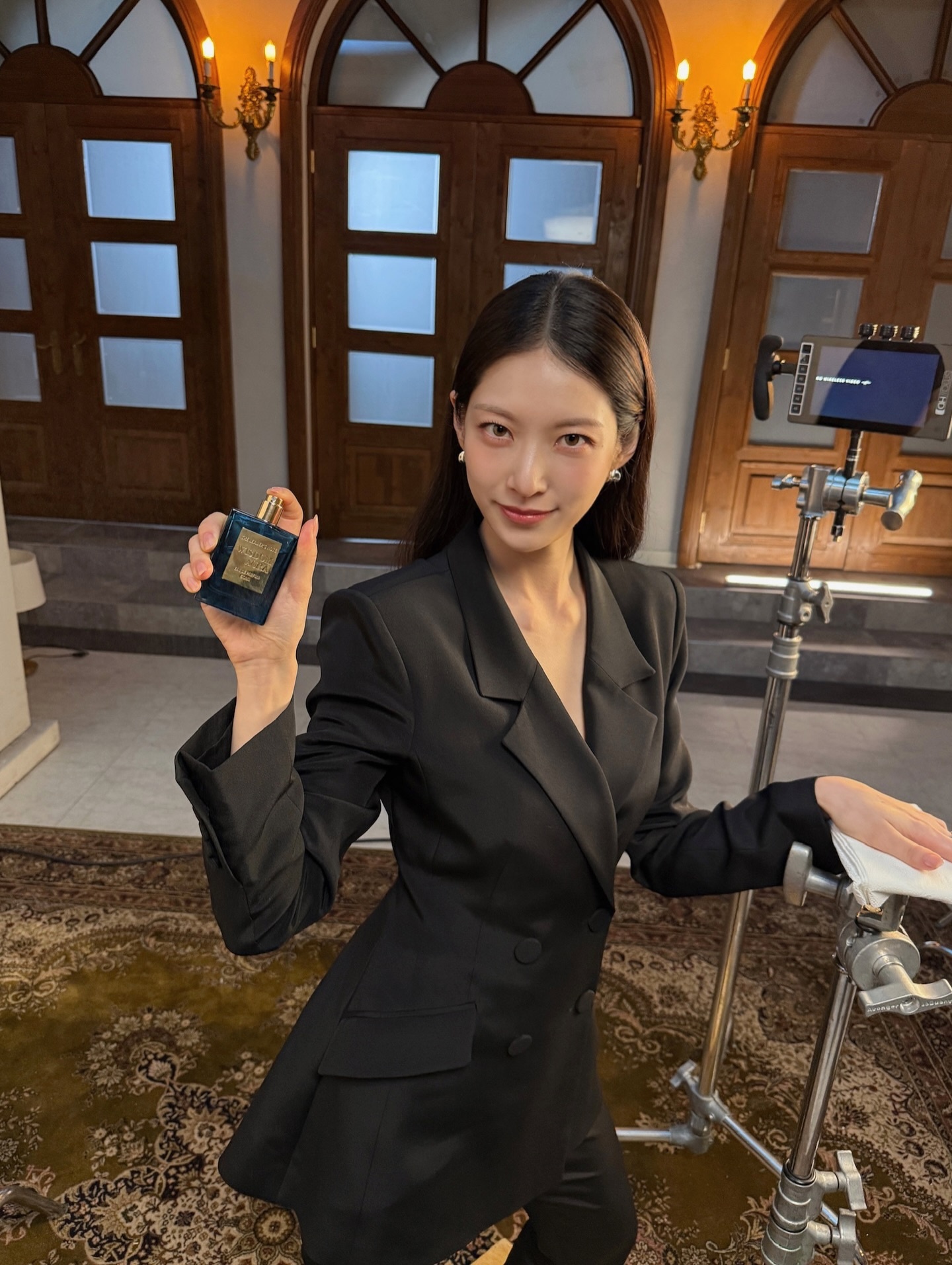 룩이 완전히 바뀌었어요! 블랙 더블 브레스트 수트로 갈아입은 공승연은 V넥 라인과 각 잡힌 어깨로 강렬한 카리스마를 발산합니다 💼 슬림한 팬츠 라인과 단정하게 넘긴 헤어 스타일이 '프로페셔널 우먼' 무드를 완벽하게 구현해줘요. 실버 이어링 하나가 블랙 수트의 차가운 분위기에 세련된 엣지를 더해주고, 향수병을 들고 응시하는 눈빛이 룩 전체를 완성해줍니다 😎