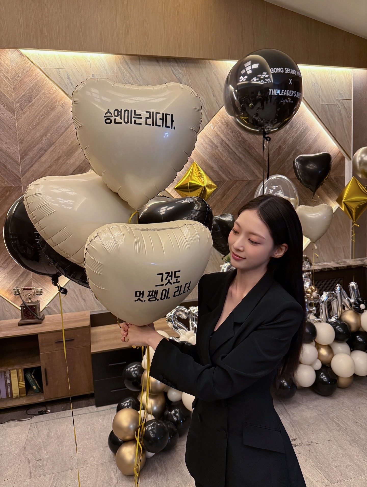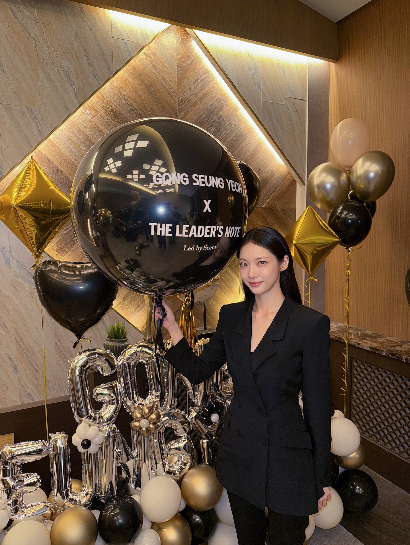 촬영 중간 팬들이 깜짝 이벤트를 준비했어요 💛 "품격있는 리더 승연♡" 글씨가 새겨진 골드 풍선을 들고 수줍게 미소 짓는 공승연의 모습이 너무 사랑스럽죠? 레드 드레스와 골드 풍선의 조합이 의도치 않게 럭셔리 컬러 팔레트를 완성했어요. 촬영에 활용된 레드 향수병 클로즈업 컷도 함께 올라와 무드가 배로 살아났답니다 🌹